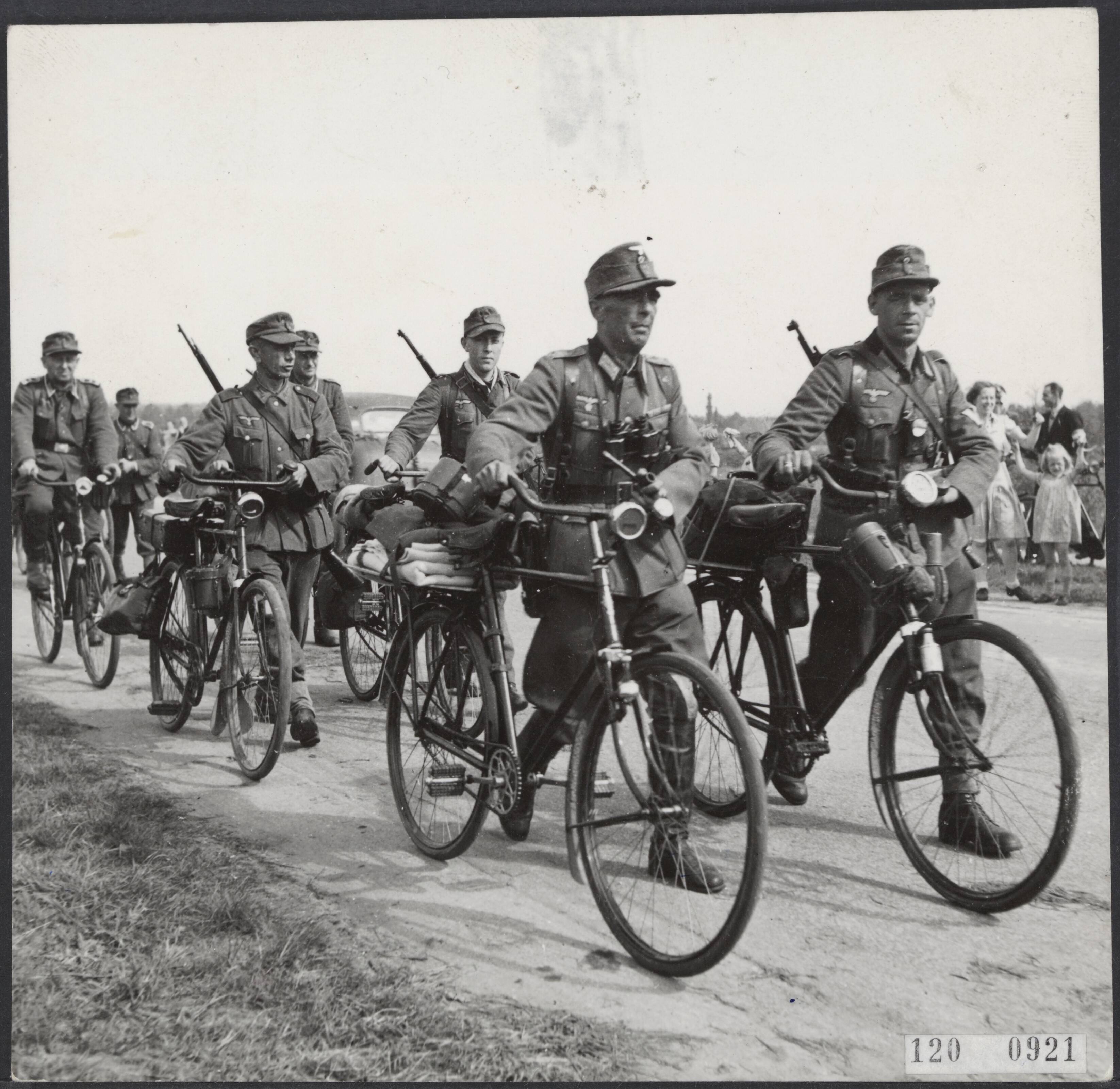 De Duitsers trekken uit het Gooi weg. Lopend naast hun fietsen gaan zij hun bagage inleveren