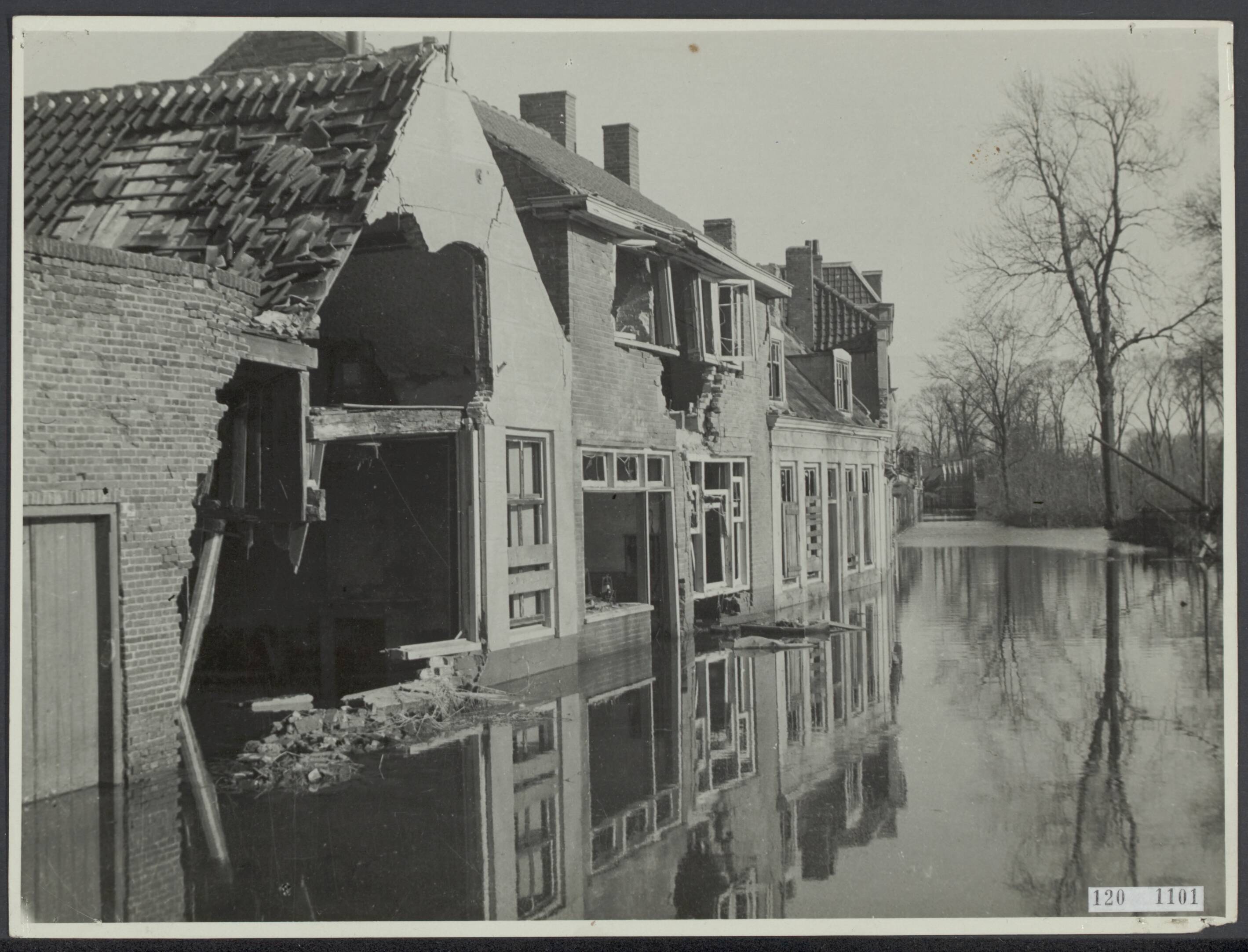 Vernielde huizen in ondergelopen gebied te Walcheren