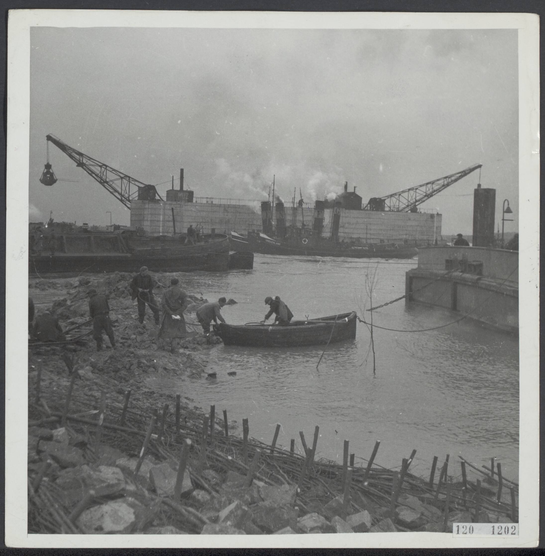 Herstelwerkzaamheden Walcheren. Het gat in de dijk bij Rammekens wordt gedicht. Op de achtergrond een af te zinken caisson, links aken met basaltblokken