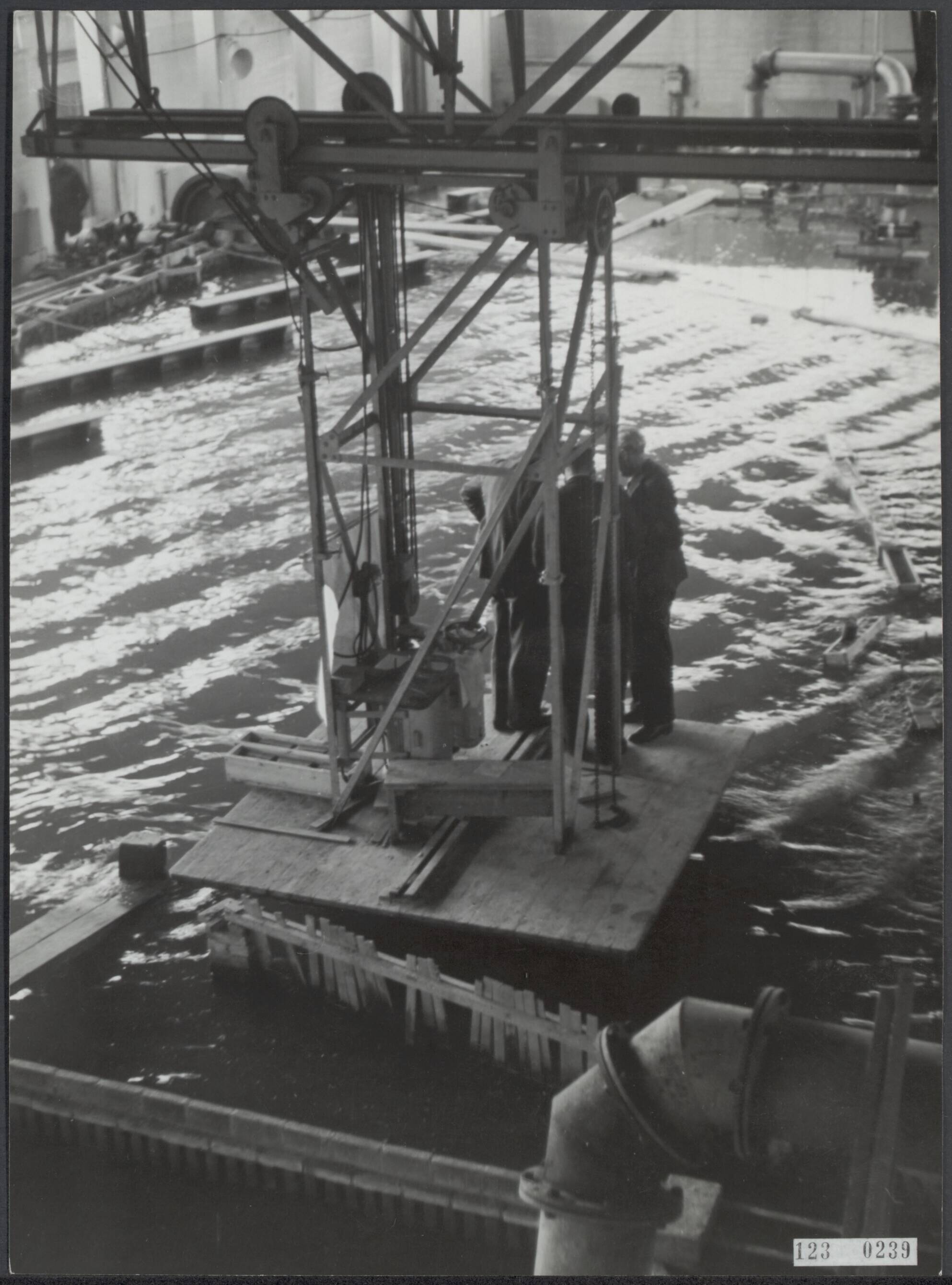 Waterloopkundig Laboratorium te Delft. Golfbrekers voor de dijk bij Nolle. Op de brug kunnen de ingenieurs naar het resultaat van hun werk kijken