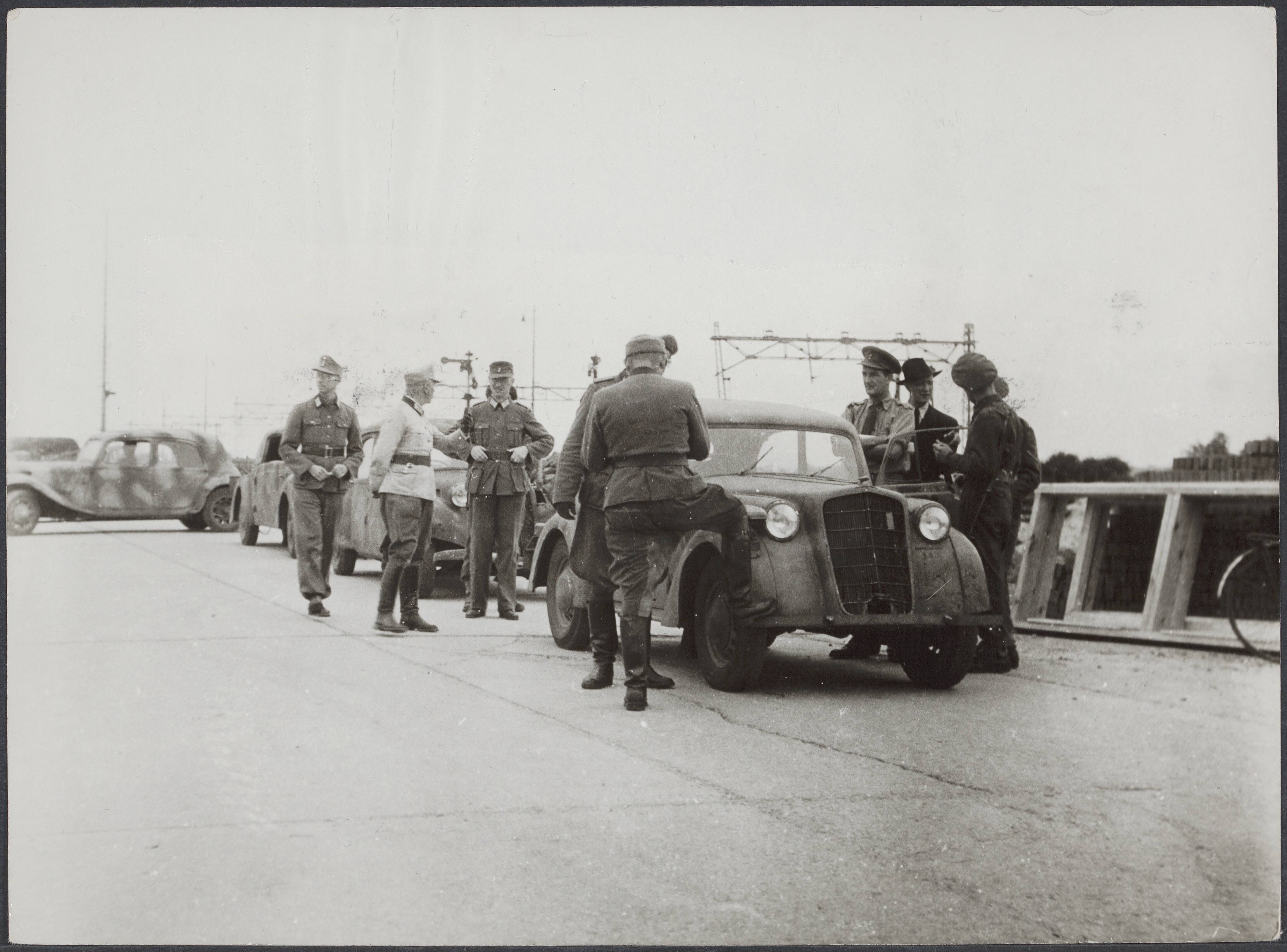 Een groep journalisten bij de ferry in Hoek van Holland, waar ze de mijnenvelden bezoeken, begeleid door Duitse officieren.