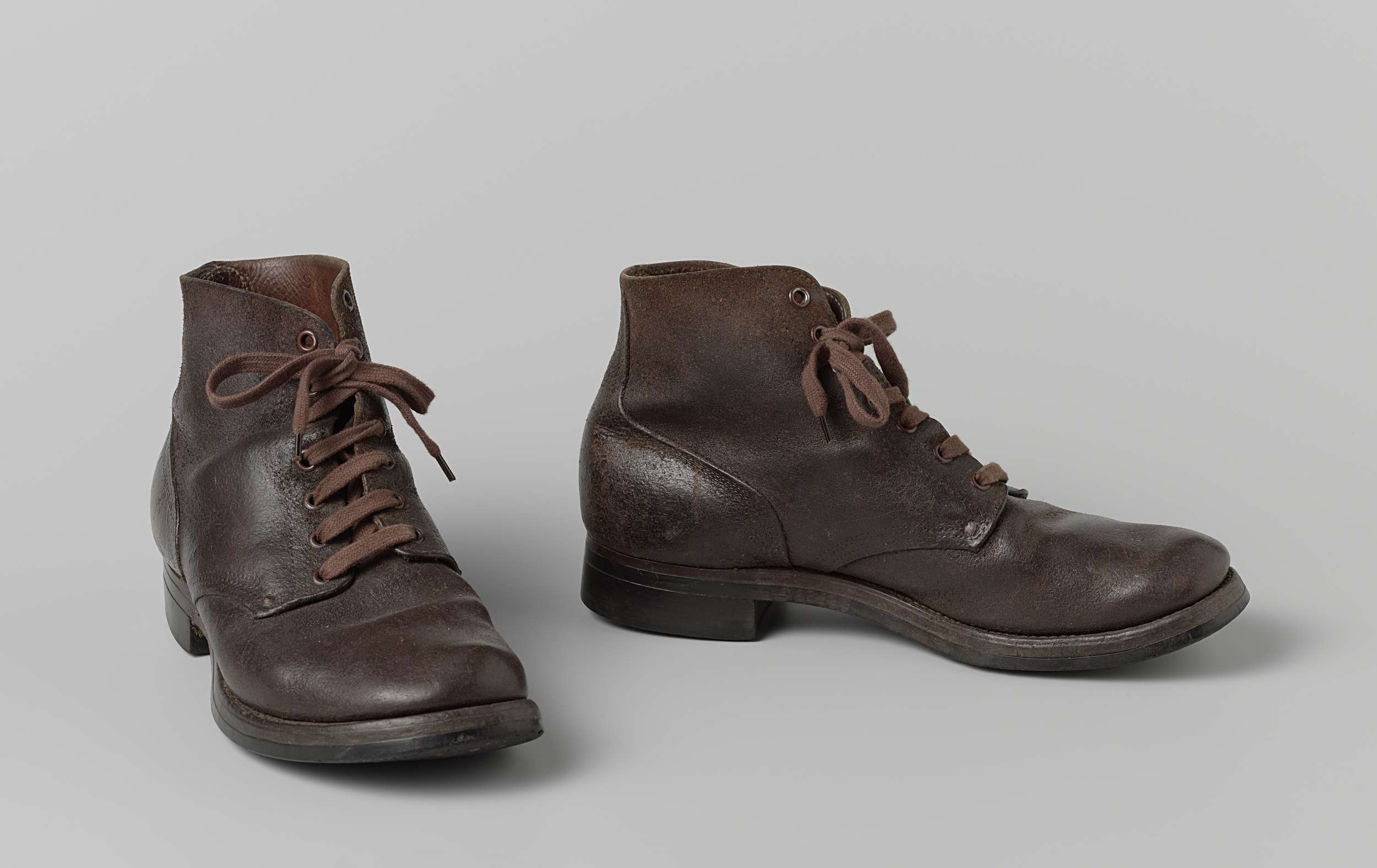Schoen gedragen door Jhr. Mr. Dr. A.W.L. Tjarda van Starkenborch Stachouwer, gekregen na de bevrijding uit een Japans kamp in 1945 van een Amerikaans militair. Zware bruin leren halfhoge schoen, sluitend aan de enkel met leren en daarover rubberen zool met spijkers. Opschrift zool rechts en links: 'WINGFOOT GOODYEAR'. Links: 'Beebe Bros'. Bruine veters.