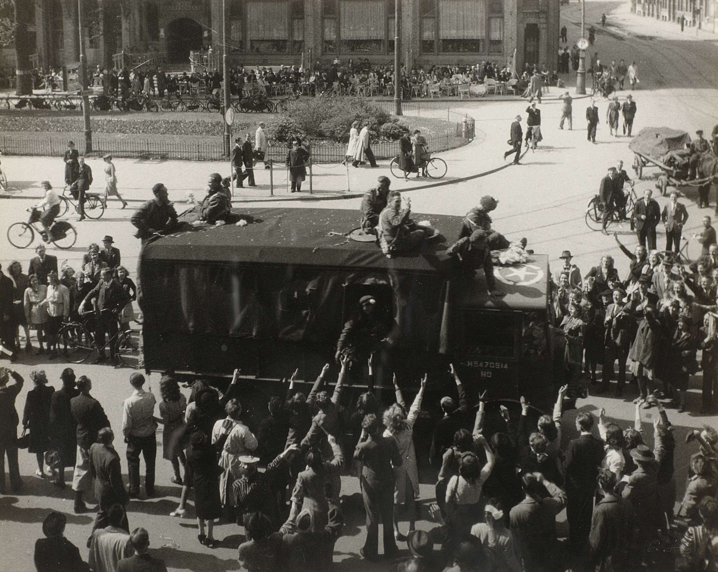 Van links komende (Canadese?) militairen in een vrachtauto, te midden van publiek, op het Leidseplein te Amsterdam; foto vanaf Hirsch-gebouw genomen (waar het atelier-Merkelbach zat) naar Hotel Americain gezien.