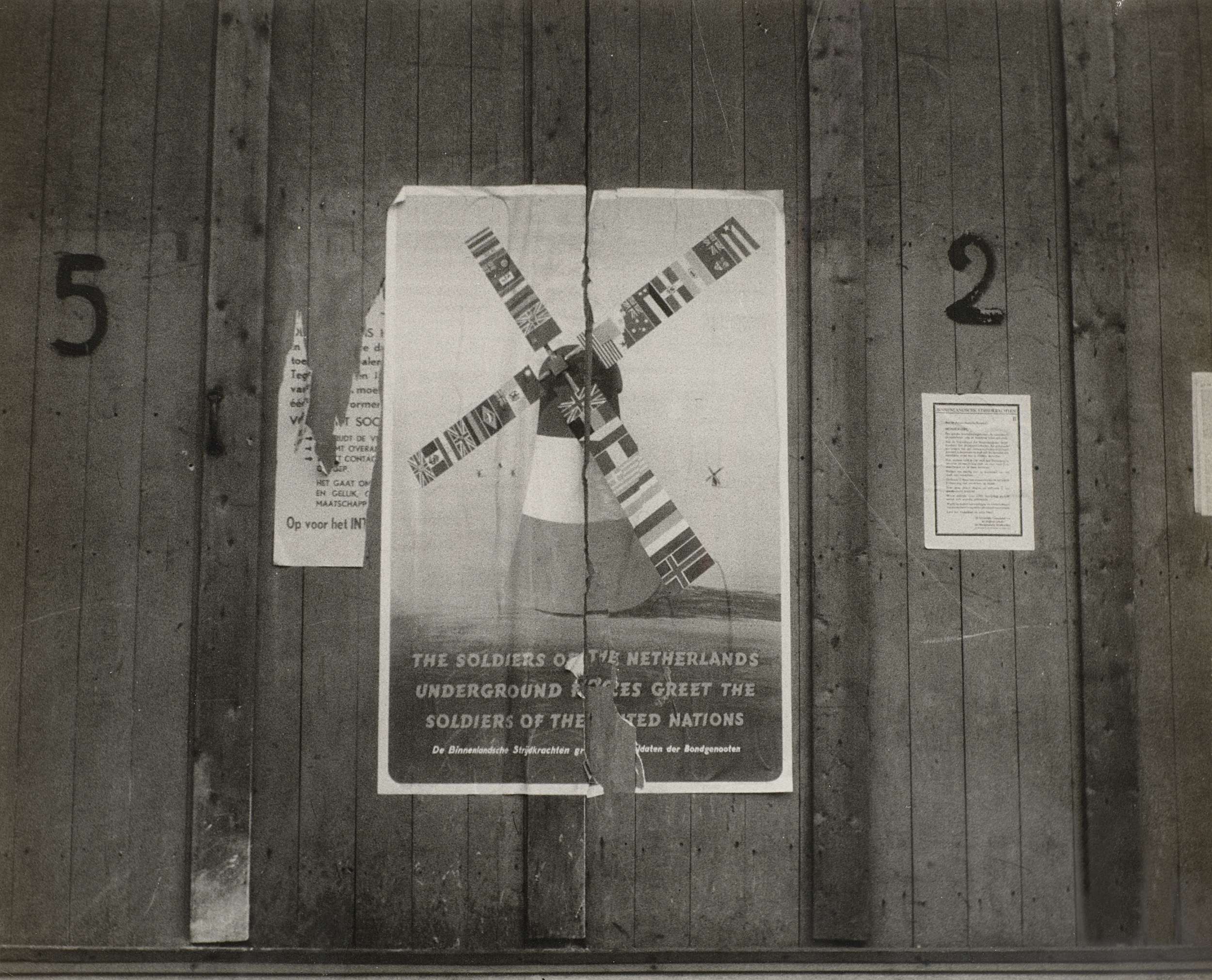 Foto van een affiche op een houten schutting, ter verwelkoming van de geallieerden. Links cijfer 5, rechts cijfer 2 en klein aanplakbiljet. Affiche: molen met wieken, samengesteld uit vlaggen, waaronder een tekst: 'The soldiers of the Netherlands Underground Forces greet the Soldiers of the United Nations'; het affiche is blijkbaar al enkele maanden oud.