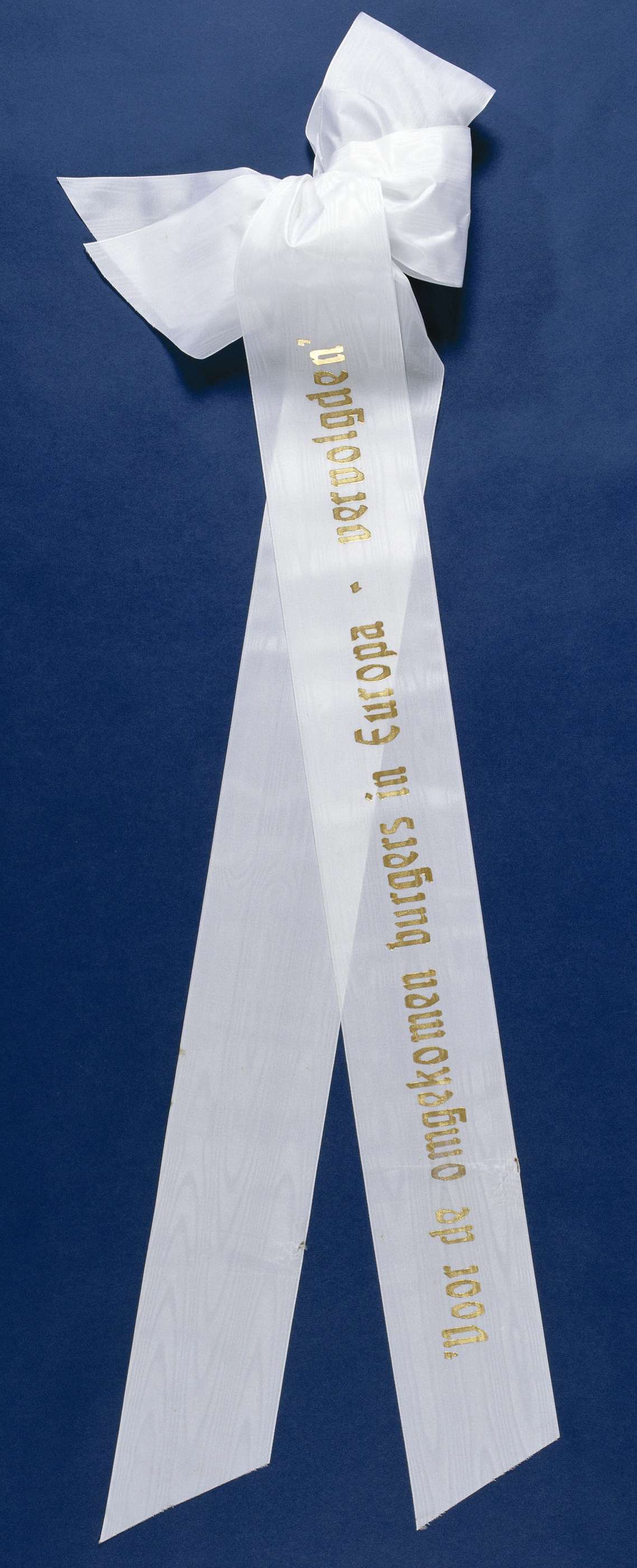 Twee aan elkaar gebonden witte linten, gelegd op 4 mei 2000 bij het Nationaal Monument op de Dam. Het bovenste lint is v.z.v. een gouden opdruk. Onderste lint is blanco. Linten zijn aan de uiteinden schuin afgeknipt. Aan een zijde tot strik samengebonden met ijzerdraad. IJzerdraad gebogen t.b.v. bevestiging aan krans.
