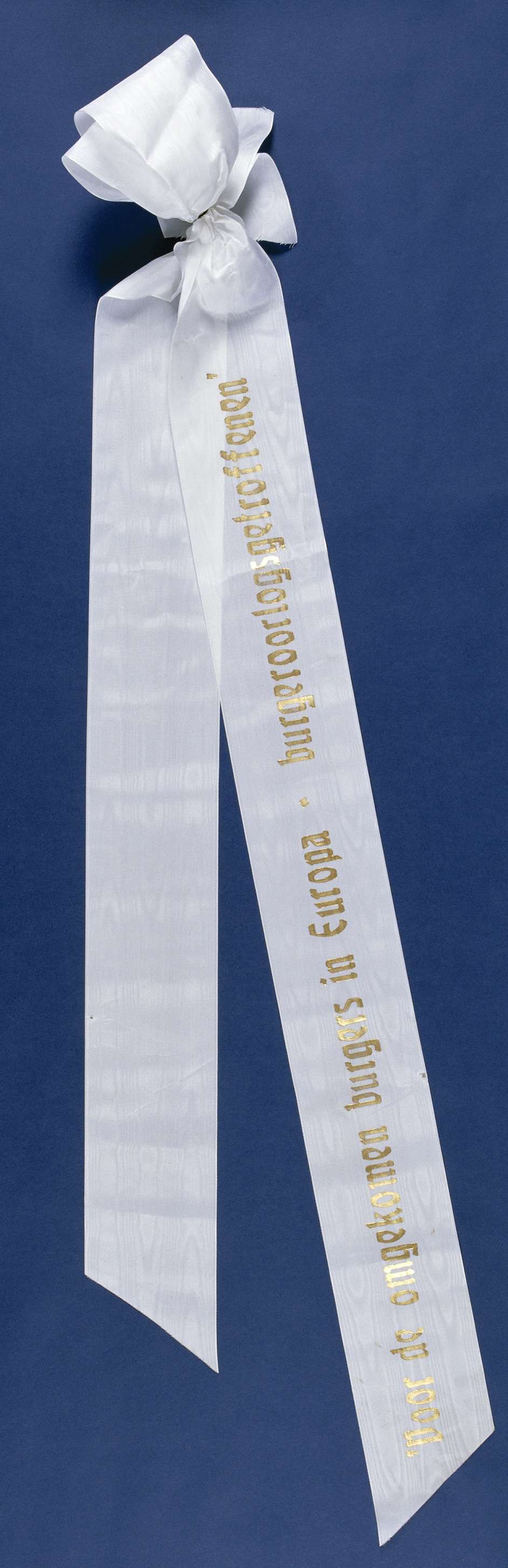 Twee aan elkaar gebonden witte linten, gelegd op 4 mei 2000 bij het Nationaal Monument op de Dam. Het bovenste lint is v.z.v. een gouden opdruk. Onderste lint is blanco. Linten zijn aan de uiteinden schuin afgeknipt. Aan een zijde tot strik samengebonden met ijzerdraad. IJzerdraad gebogen t.b.v. bevestiging aan krans.