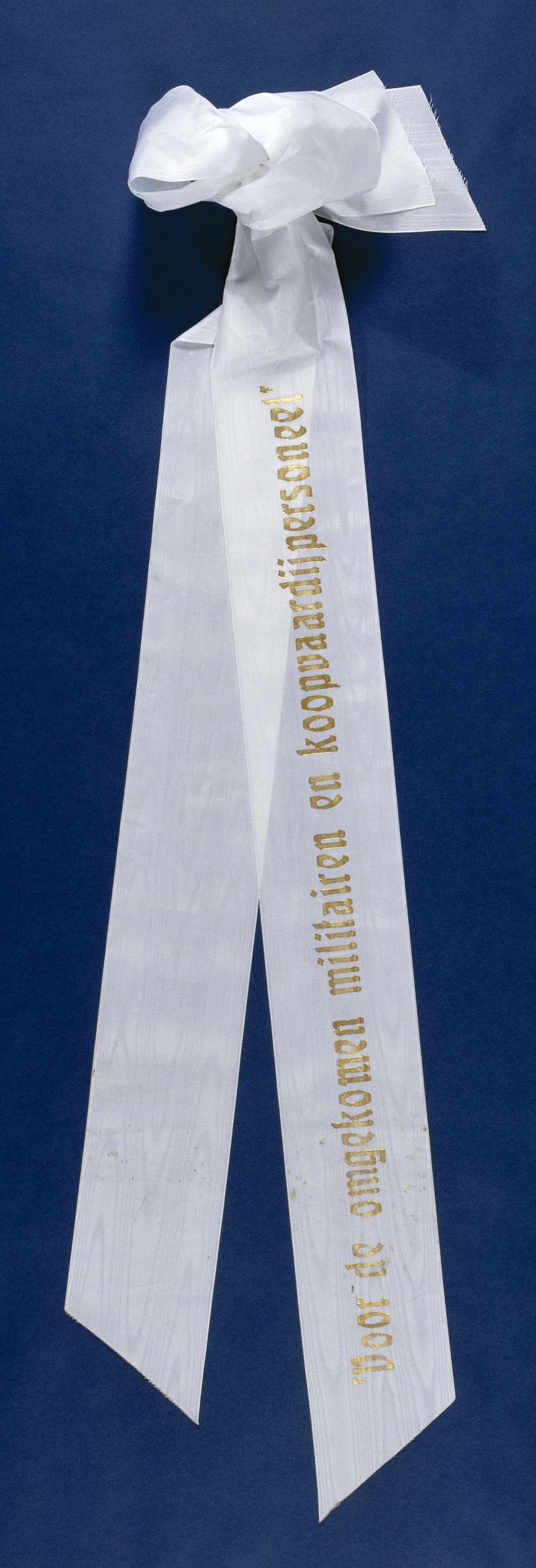 Twee aan elkaar gebonden witte linten, gelegd op 4 mei 2000 bij het Nationaal Monument op de Dam. Het bovenste lint is v.z.v. een gouden opdruk. Onderste lint is blanco. Linten zijn aan de uiteinden schuin afgeknipt. Aan een zijde tot strik samengebonden met ijzerdraad. IJzerdraad gebogen t.b.v. bevestiging aan krans.