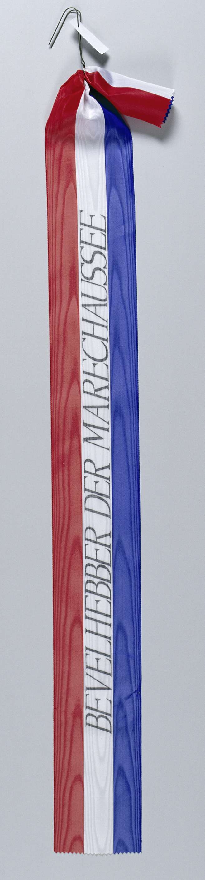 Lint met drie horizontale banen rood, wit en blauw, gelegd op 4 mei 2000 bij het Nationaal Monument op de Dam. In de witte baan een opschrift in zwart. Uiteinden recht afgeknipt met kartelschaar. Aan een zijde gebonden met ijzerdraad, dez is gebogen t.b.v. bevestiging aan krans.