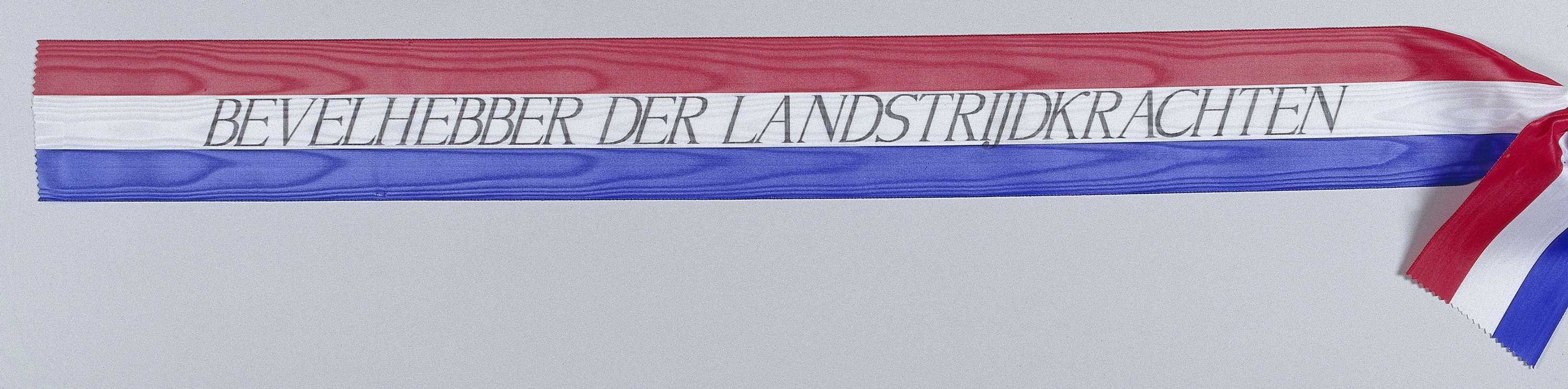 Lint met drie horizontale banen rood, wit en blauw, gelegd op 4 mei 2000 bij het Nationaal Monument op de Dam. In de witte baan een opschrift in zwart. Uiteinden recht afgeknipt met kartelschaar. Aan een zijde gebonden met ijzerdraad, dez is gebogen t.b.v. bevestiging aan krans.