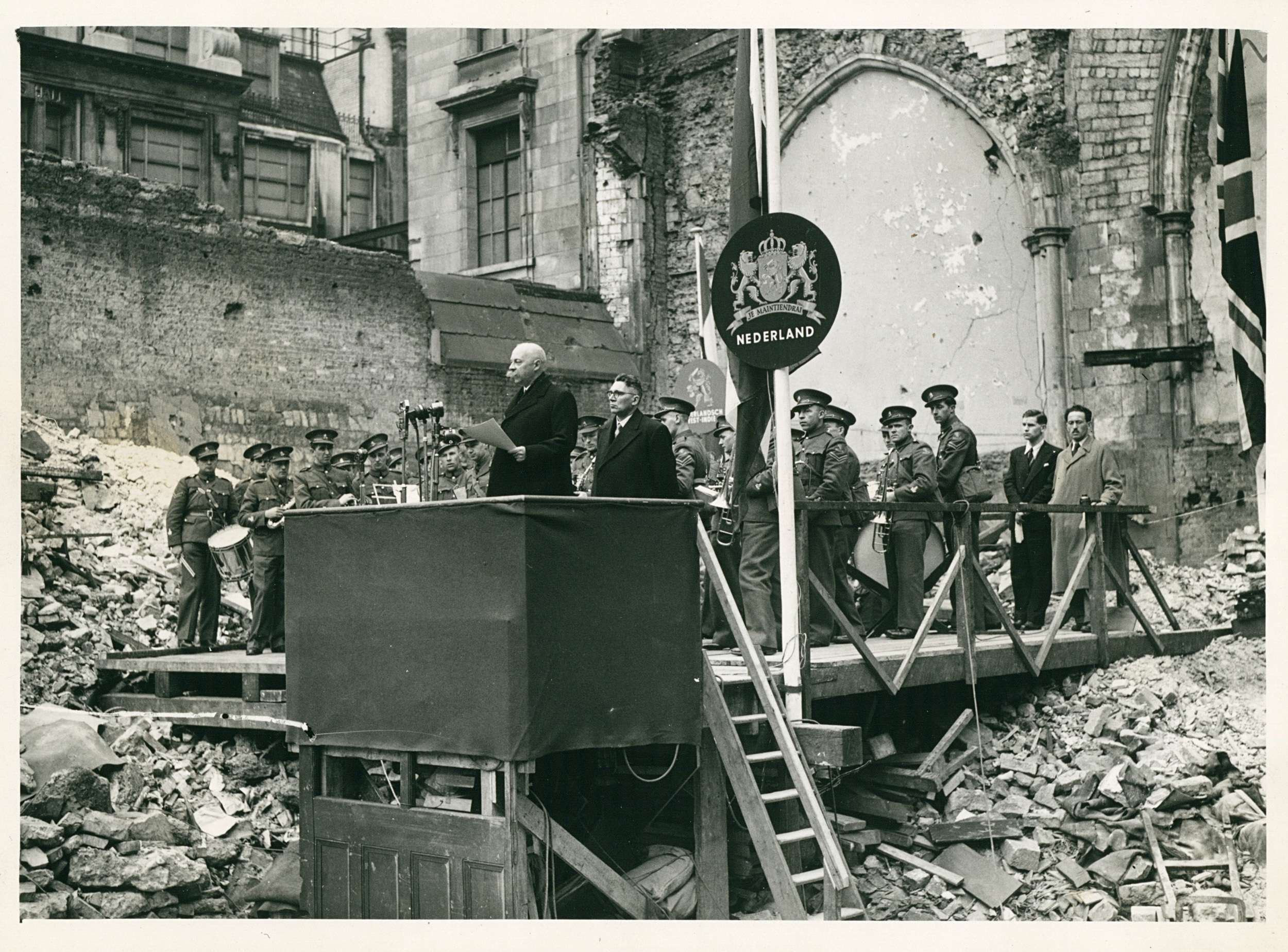 In de restanten van de totaal aan puin geschoten Nederlands Hervormde Kerk 'Austin Friars' te Londen houdt minister-president Gerbrandy een toespraak ter herdenking aan de Duitse inval in Nederland. Met op het podium naast Gerbrandy het wapen van Nederland bevestigd aan een vlaggenstok met daaraan wapperend de Nederlandse vlag, in de hoek de Engelse vlag. Op het podium een militaire kapel.