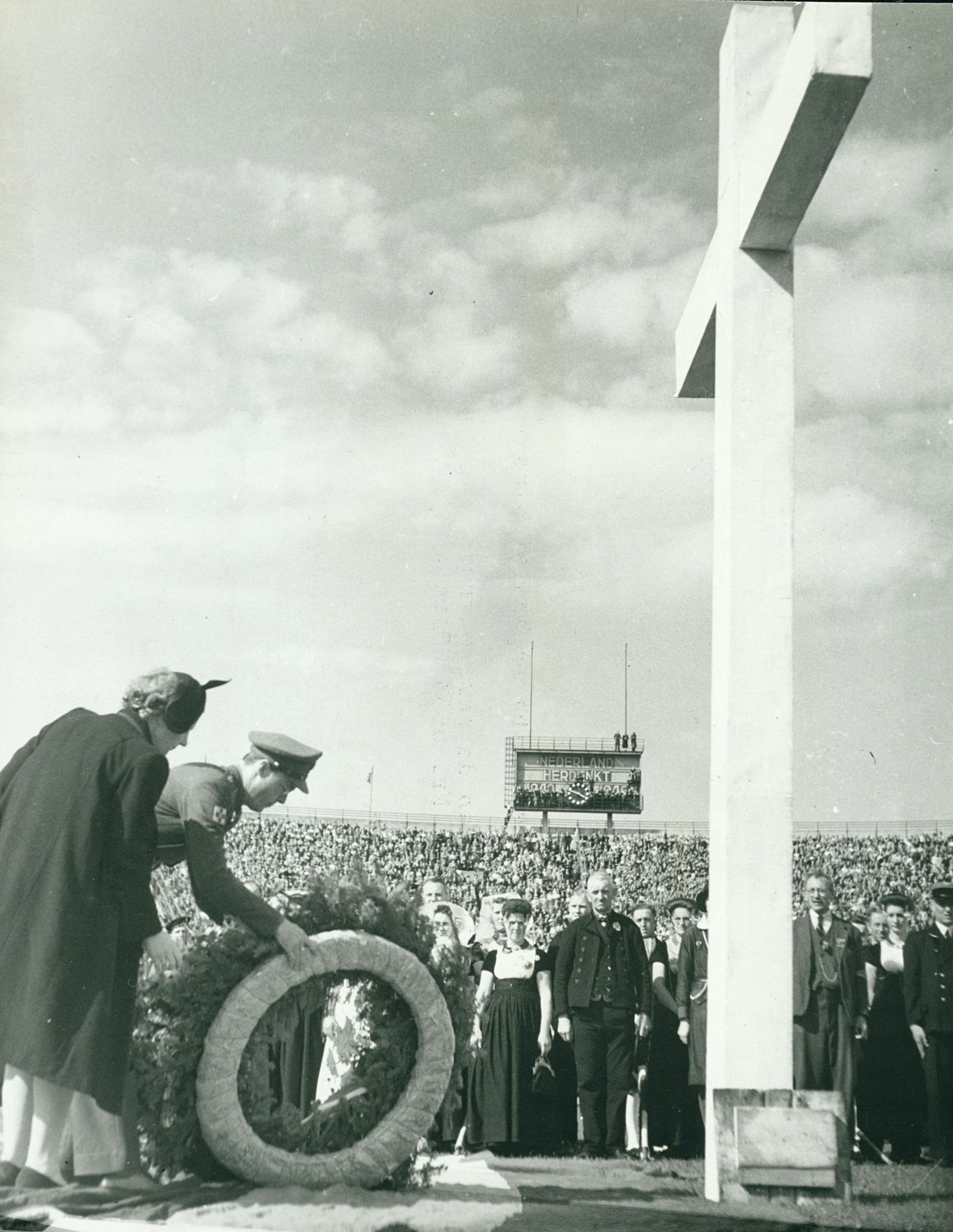 Eerste nationale bevrijdingsfeest in het Olympisch Stadion: Juliana en Bernhard leggen krans