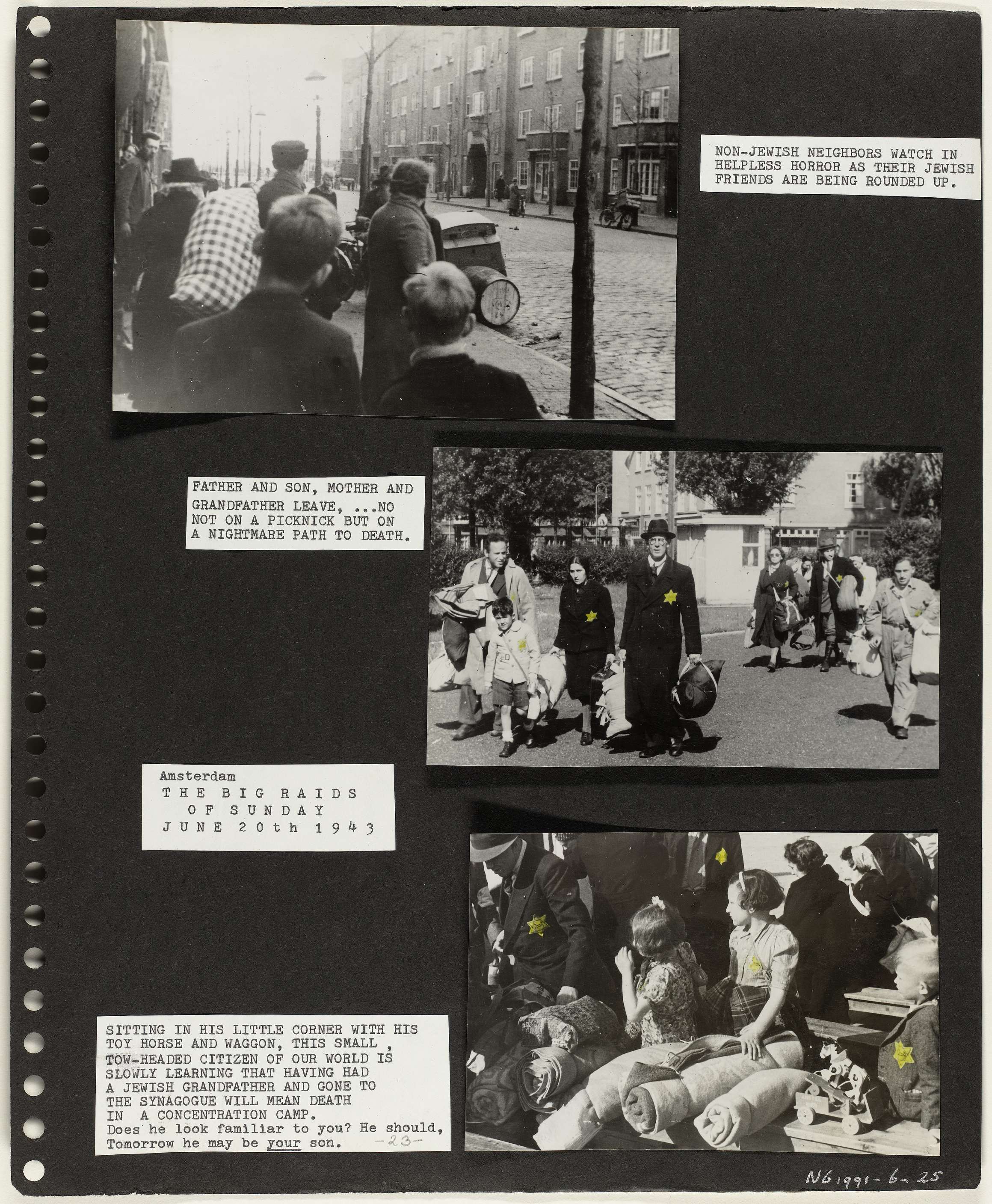 Drie foto's van de Jodenvervolging in Amsterdam: niet-Joodse bewoners kijken naar het weghalen van de Joodse bewoners in Amsterdam oost (b.m.). Joodse bewoners op weg naar een station (m.) en Joodse bewoners op de verzamelplaats aan de Polderweg (m.o.).