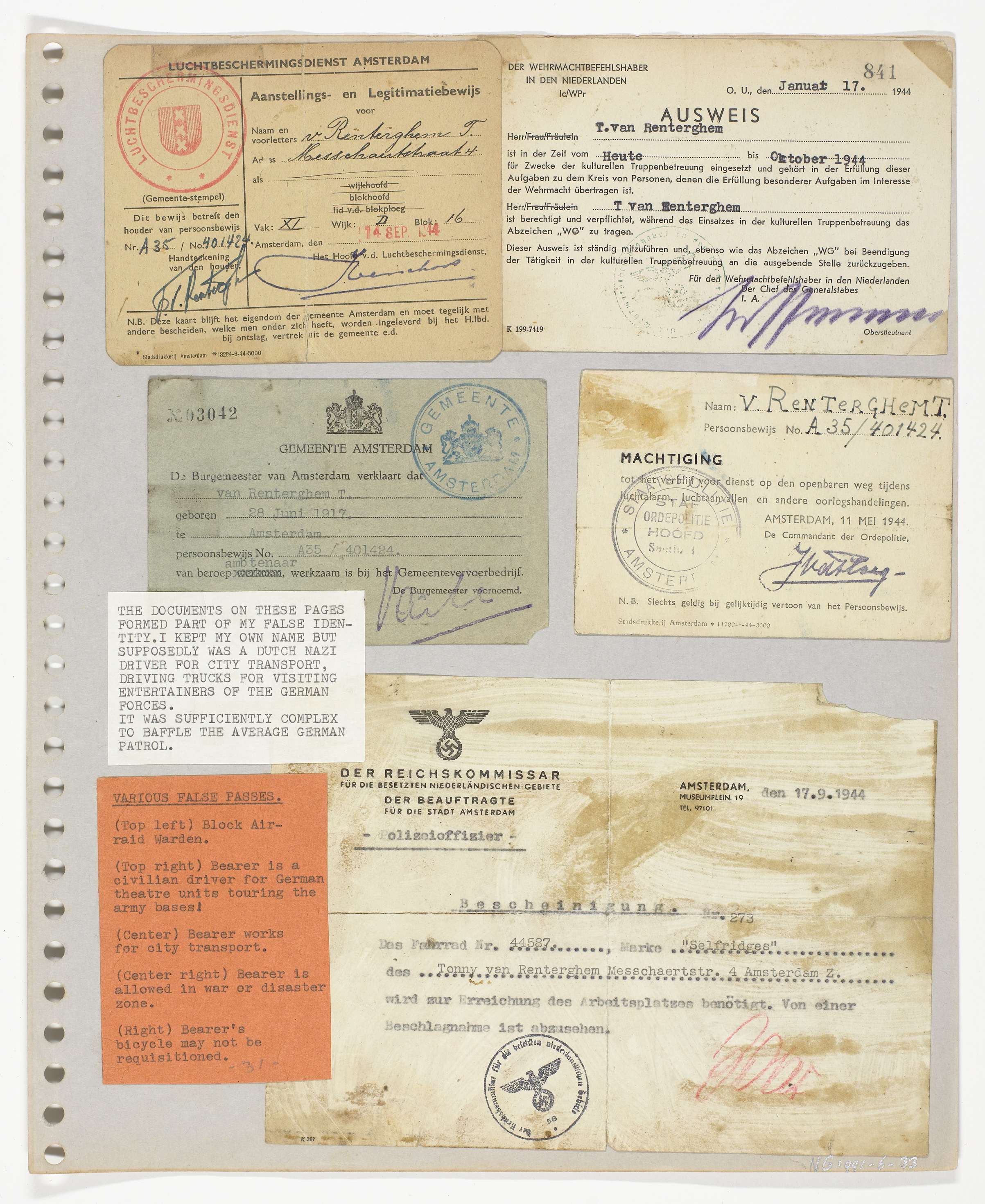 Vijf valse documenten die Tony van Renterghem gebruikte bij zijn verzetswerk.