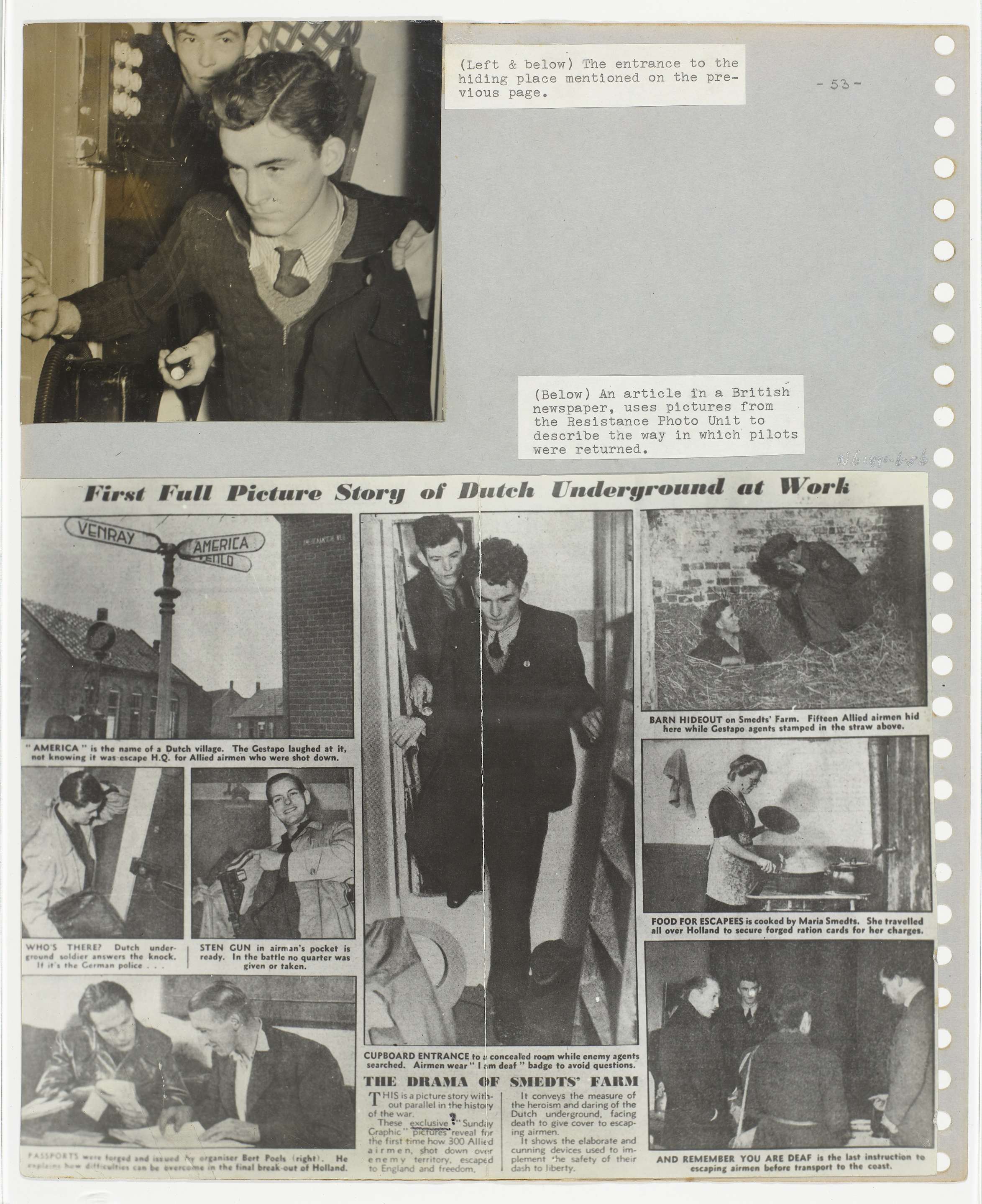 Een foto van ondergedoken Amerikaanse piloten. Twee Amerikaanse piloten ondergedoken in Amsterdam in de ingang van hun schuilplaats. Onder: pagina uit een Engelse krant met foto's van het verzet van de onderduiksituaties van piloten.