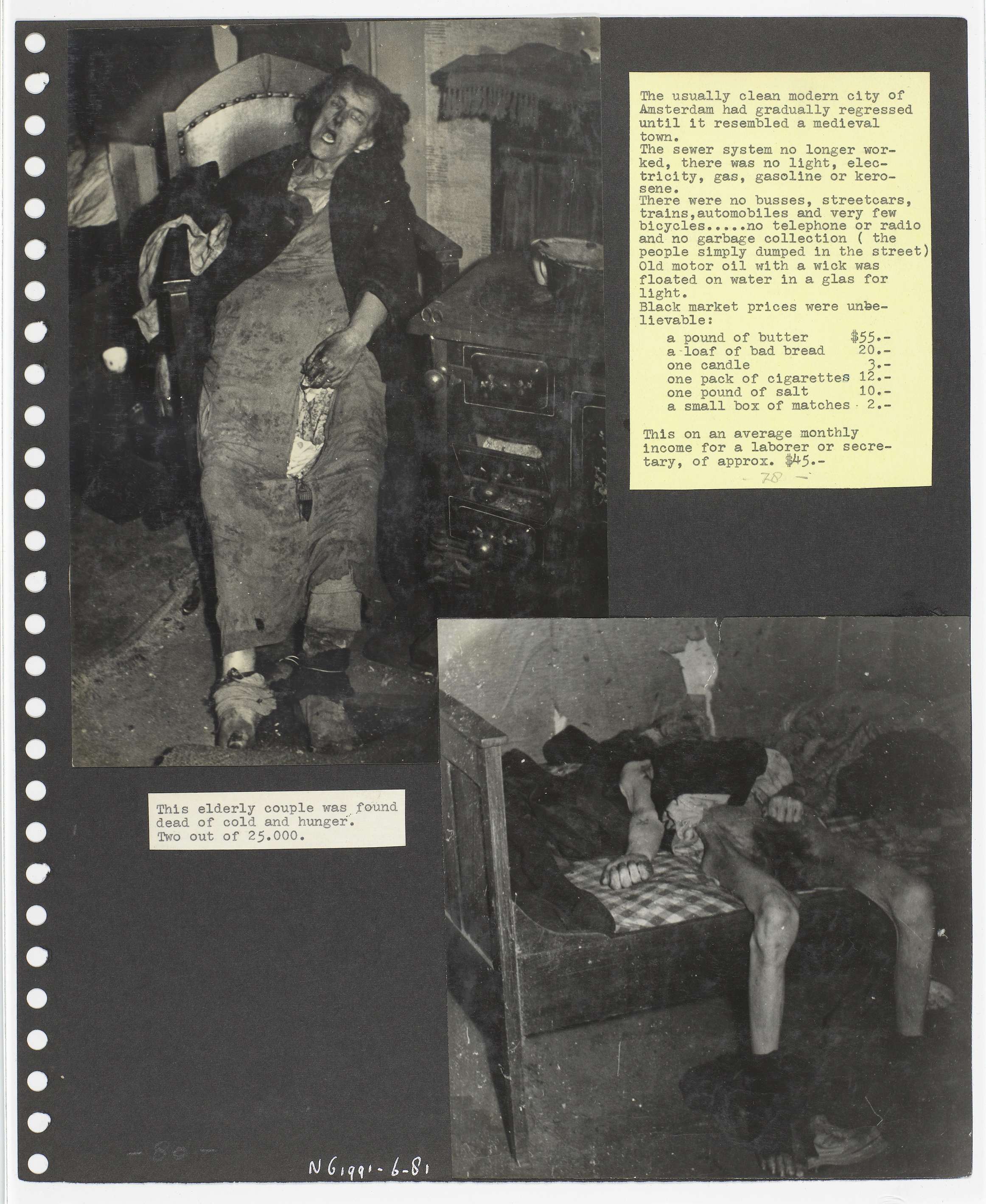 Twee foto's over de gevolgen van de honger. Foto boven: een dode vrouw in haar stoel. Foto onder: dode man in zijn bed. Beiden werden pas gevonden toen zij al overleden waren.
