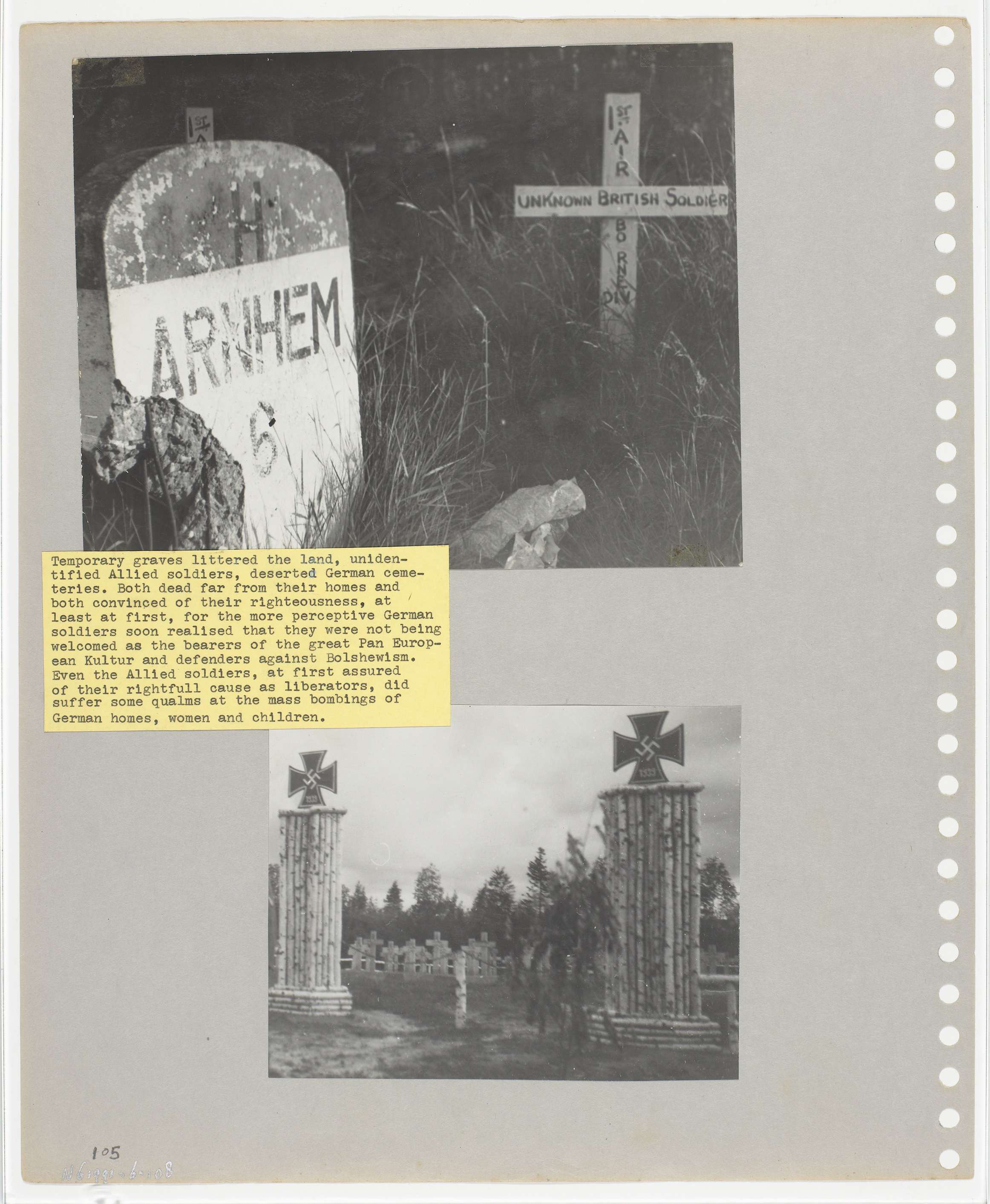 Twee foto's van kort na de bevrijding. Foto boven: graf van een onbekende Engelse soldaat in de buurt van Arnhem. Naast het graf een wegwijzer naar Arnhem. Onderste foto: Duits kerkhof