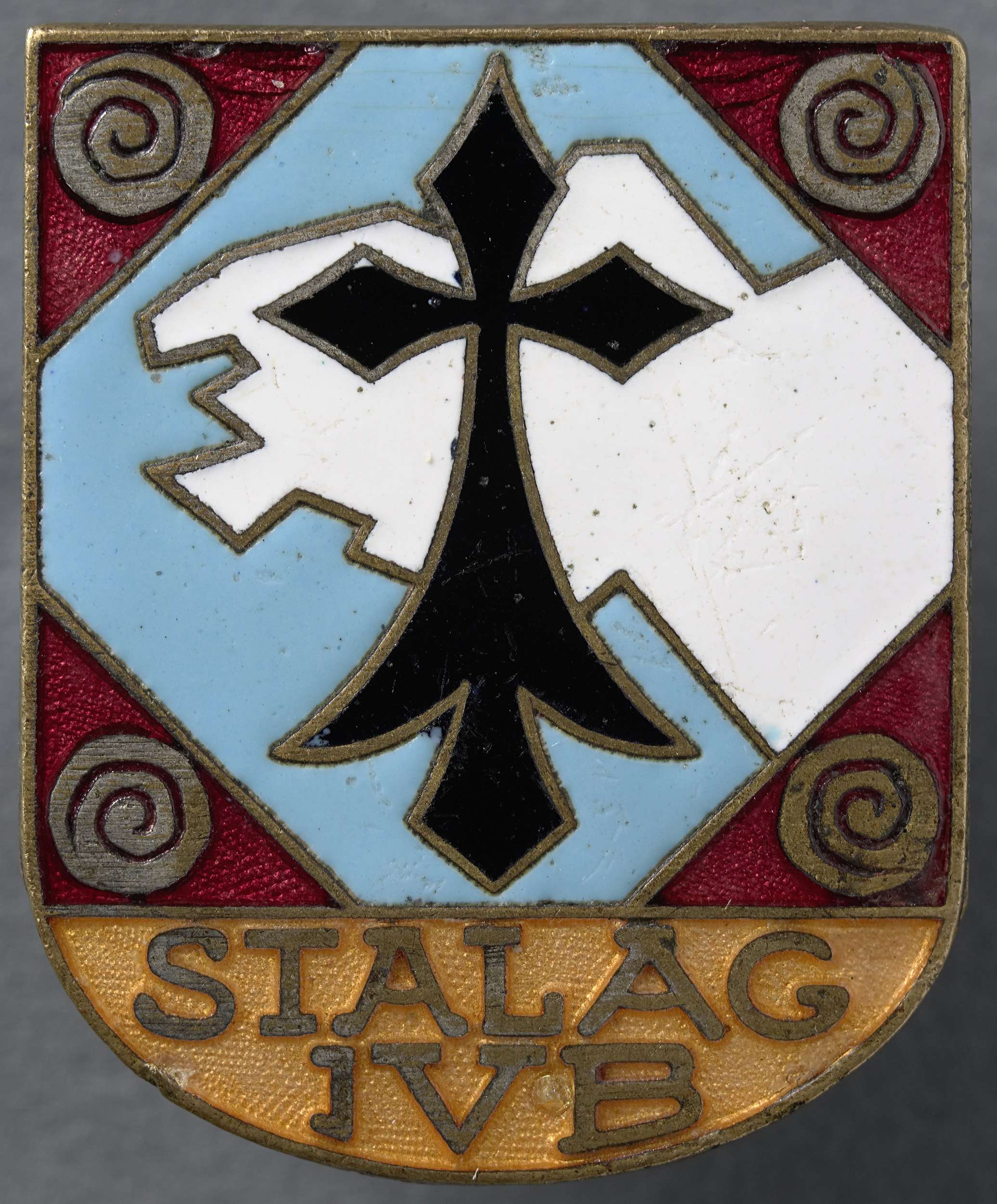 Metalen schildje met afbeelding in email, kleuren: zwart, wit, blauw, rood en goud. Onder opschrift in kleur goud op geel. Speld aan achterzijde afgebroken. Vermoedelijk van een bewaker in Stalag IVB in Mühlberg aan de Elbe.