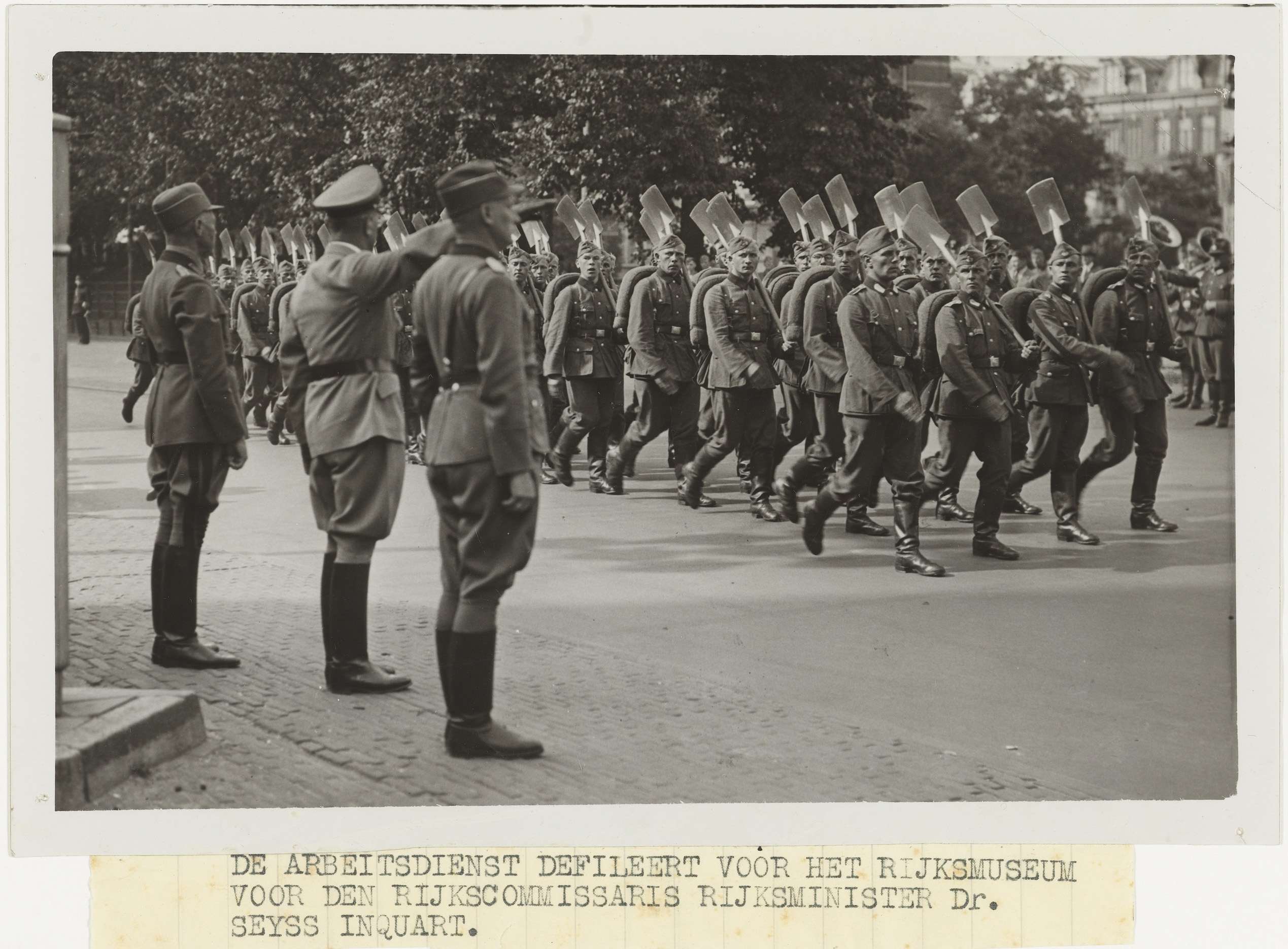 Voor het Rijksmuseum houdt de Duitse Reichsarbeitsdienst een defilé voor Seyss Inquart, die de Hitler groet brengt. Tekststrookje aan foto geplakt.