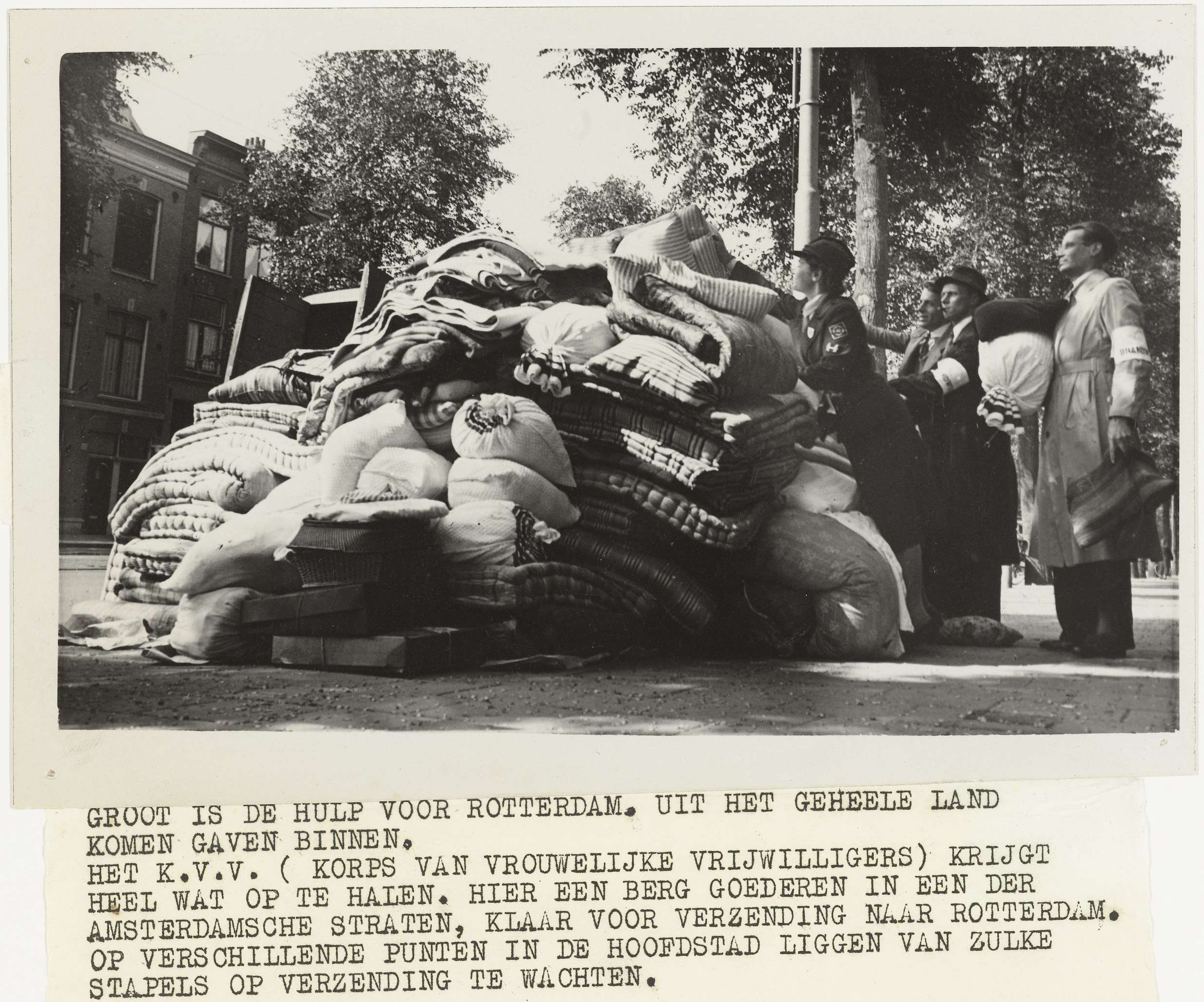 Hulpgoederen, zoals matrassen en dekens zijn ingezameld door het Korps Vrouwelijke Vrijwilligers en liggen gereed voor verzending naar Rotterdam. Tekststrookje aan foto geplakt.