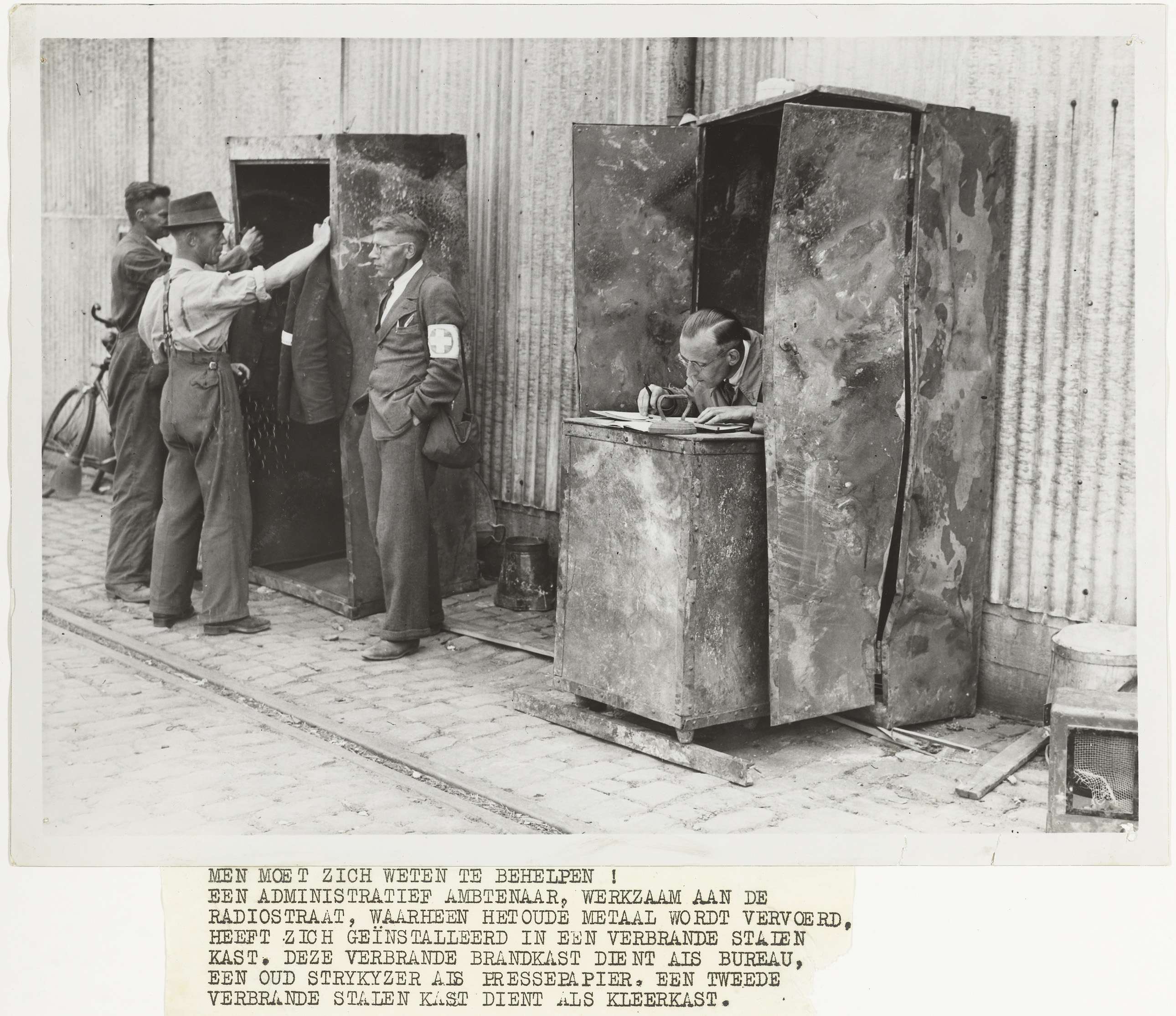 Een ambtenaar heeft een werkplek gemaakt van een verbrande stalen kast met een brandkast als bureau. Zo kan hij het oude metaal dat hier wordt verzameld administratief bijhouden. Tekststrookje aan foto geplakt.