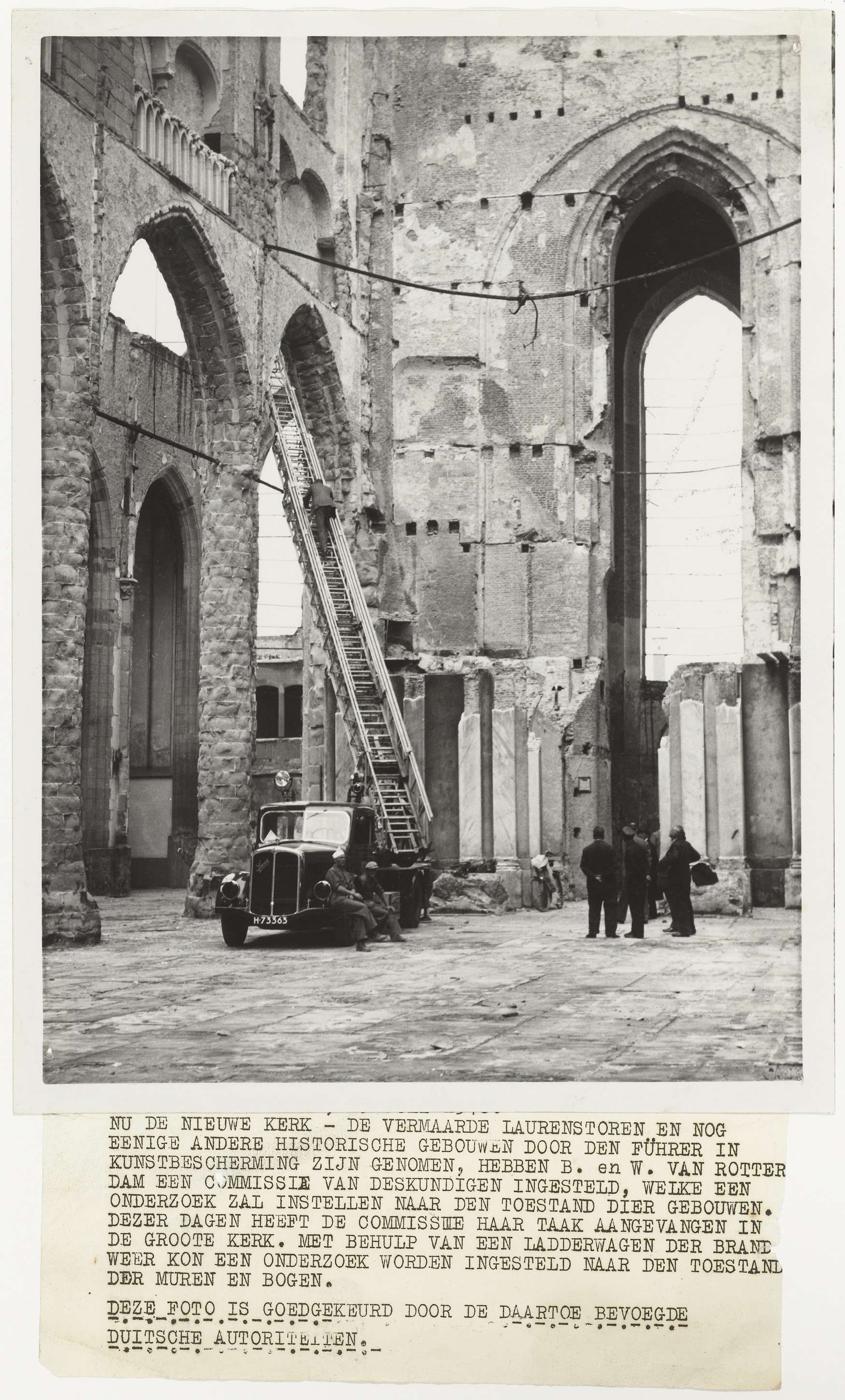 De brandweer controleert de toestand van de Laurenstoren van de Groote kerk. Het bijschrift bij deze foto is zeer interessant. Tekststrookje aan foto geplakt.