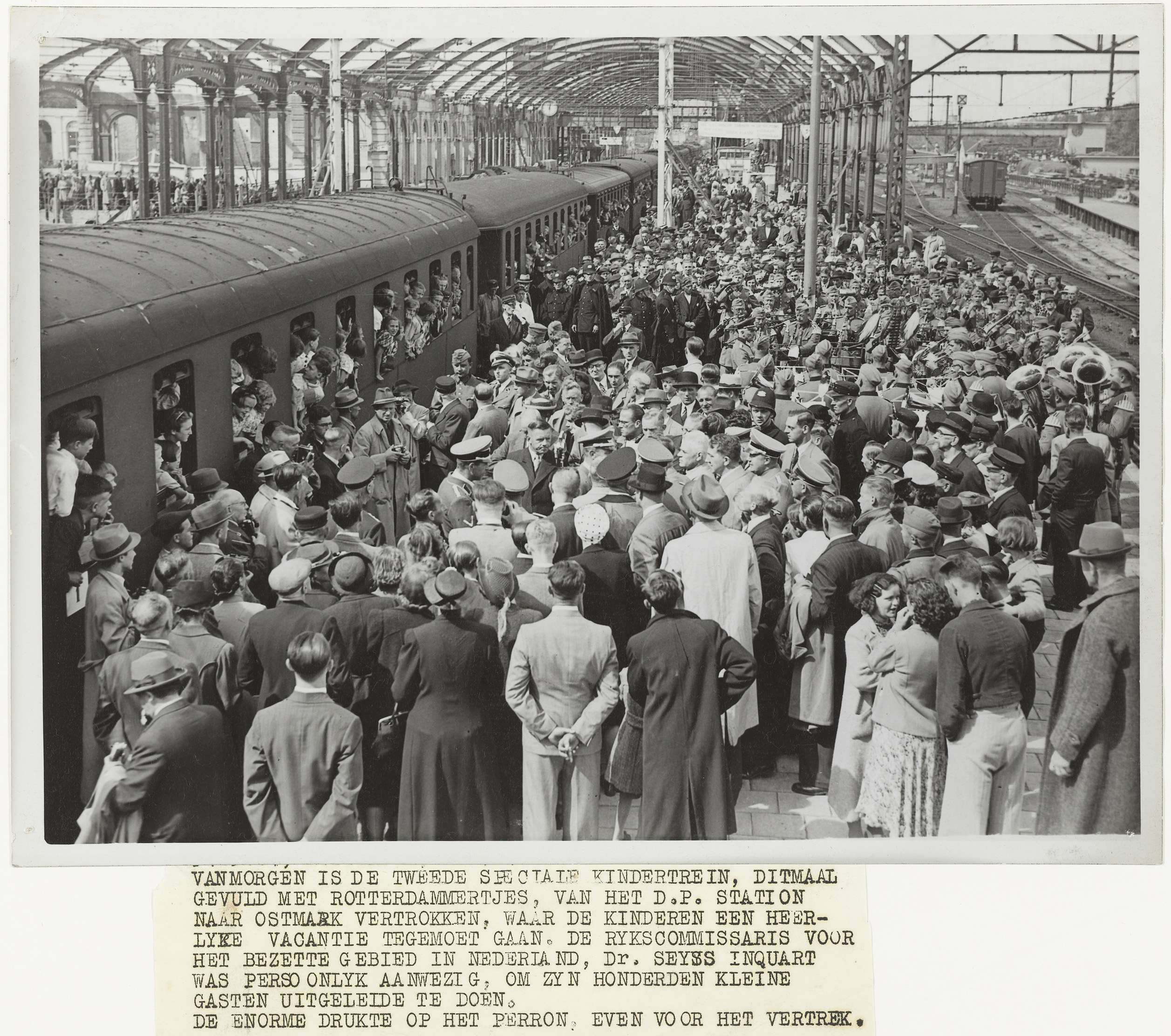 Duitse autoriteiten waaronder Seyss Inquart nemen op het station afscheid van honderden kinderen die voor een korte vakantie naar de 'Ostmark' (Oostenrijk) gaan. De Duitsers hadden besloten 6000 Rotterdamse kinderen zo'n vakantie aan te bieden. Dit was de tweede speciale kindertrein. Seyss Inquart staat geheel links in regenjas. Tekststrookje aan foto geplakt.
