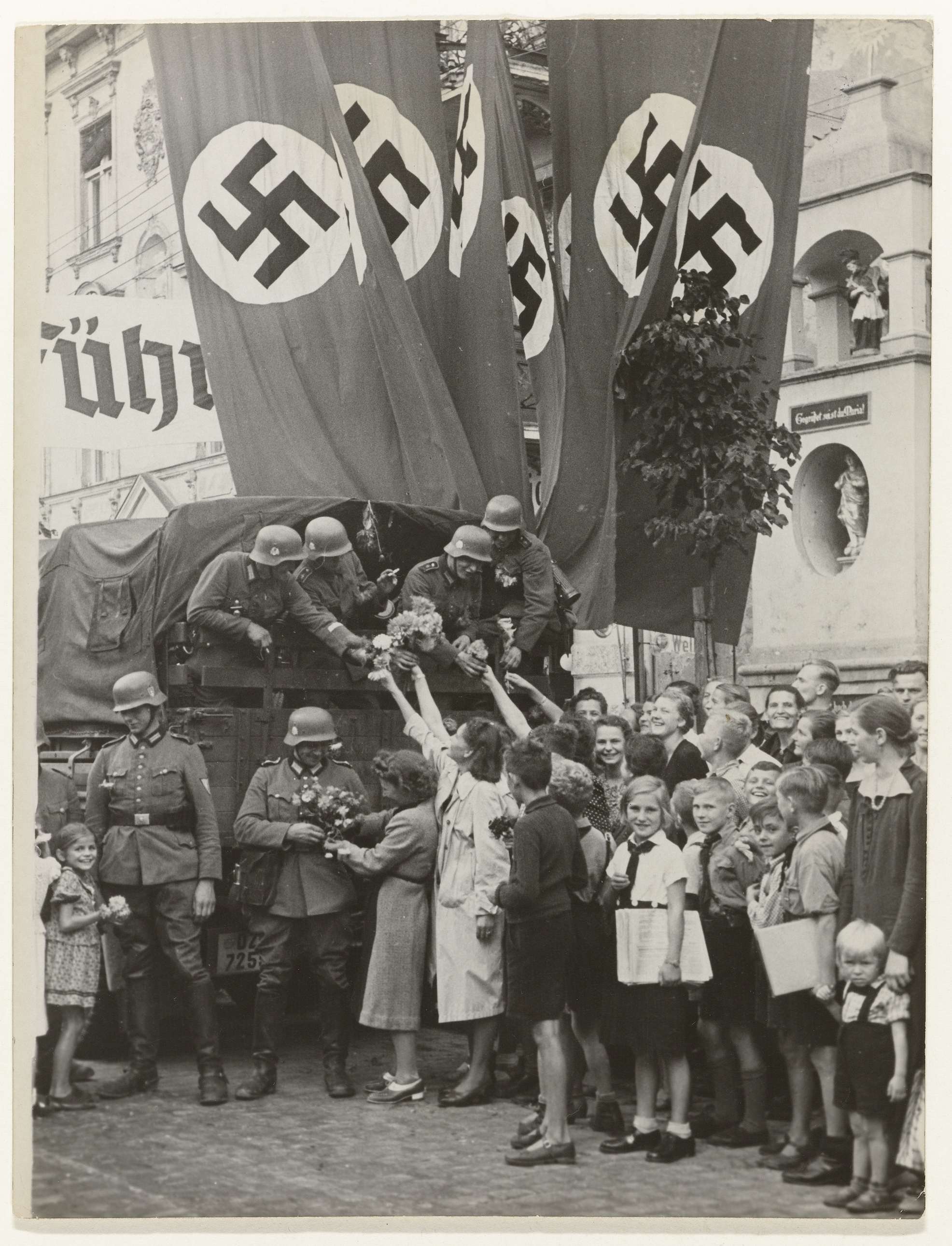 De Duitse troepen worden toegejuigd na hun bevrijding van Danzig. Op 1 september 1939 viel Hitler Polen binnen, Danzig ( volgens de Duitser een "Duitse"stad) was een van de eerste die bezet werd.