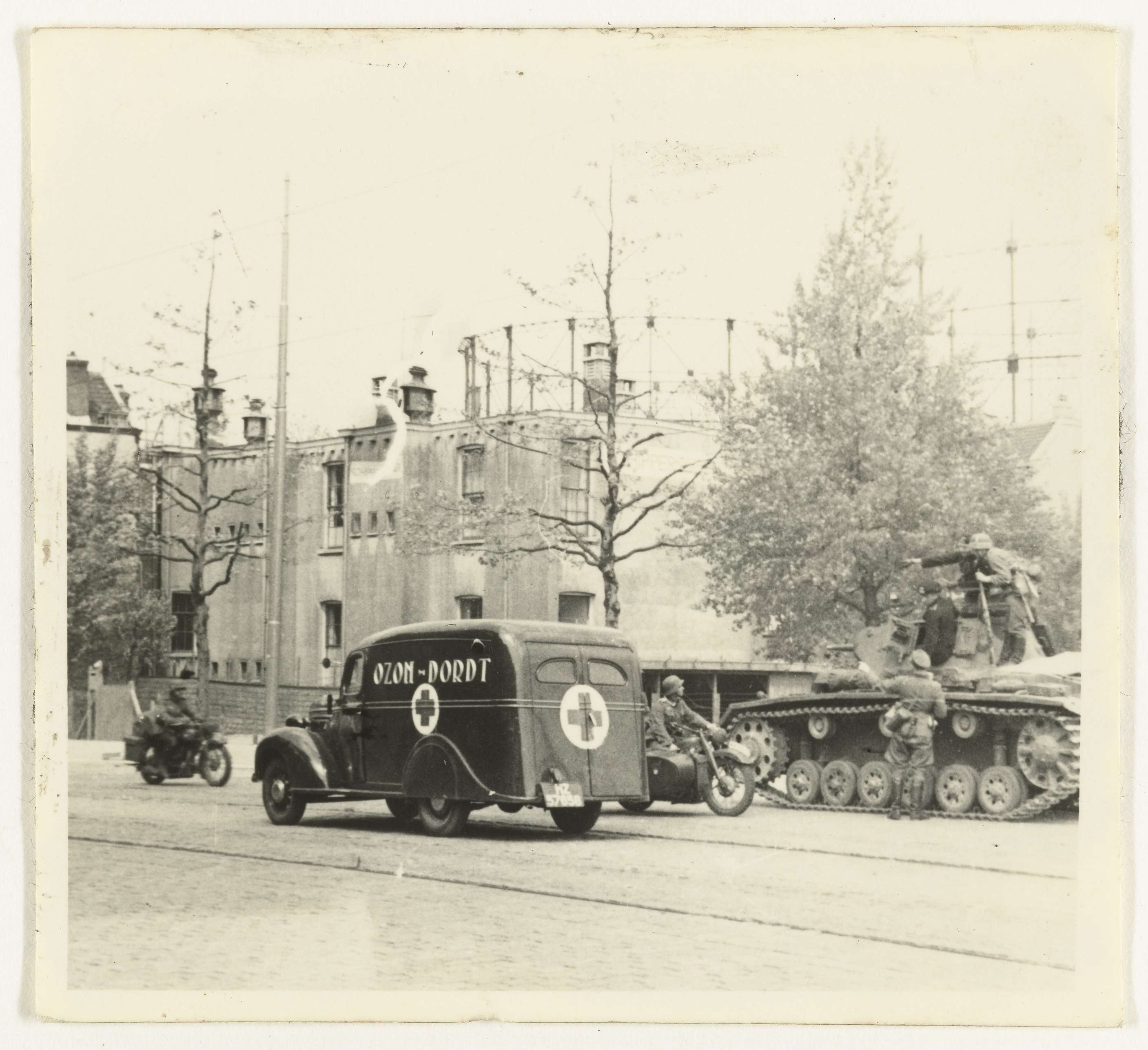 In een straat staat een tank met Duitse soldaten, infanteristen, er op en er naast. Naast de tank een Duitse soldaat op een motor met zijspan, een motorordonnans. Links van de tank een ambulance met het opschrift: Ozon-Dordt en een nummerbord met NZ. Voor de ambulance rijdt een Duitse soldaat op een motorfiets. Op de achtergrond zijn twee gashouders te zien.