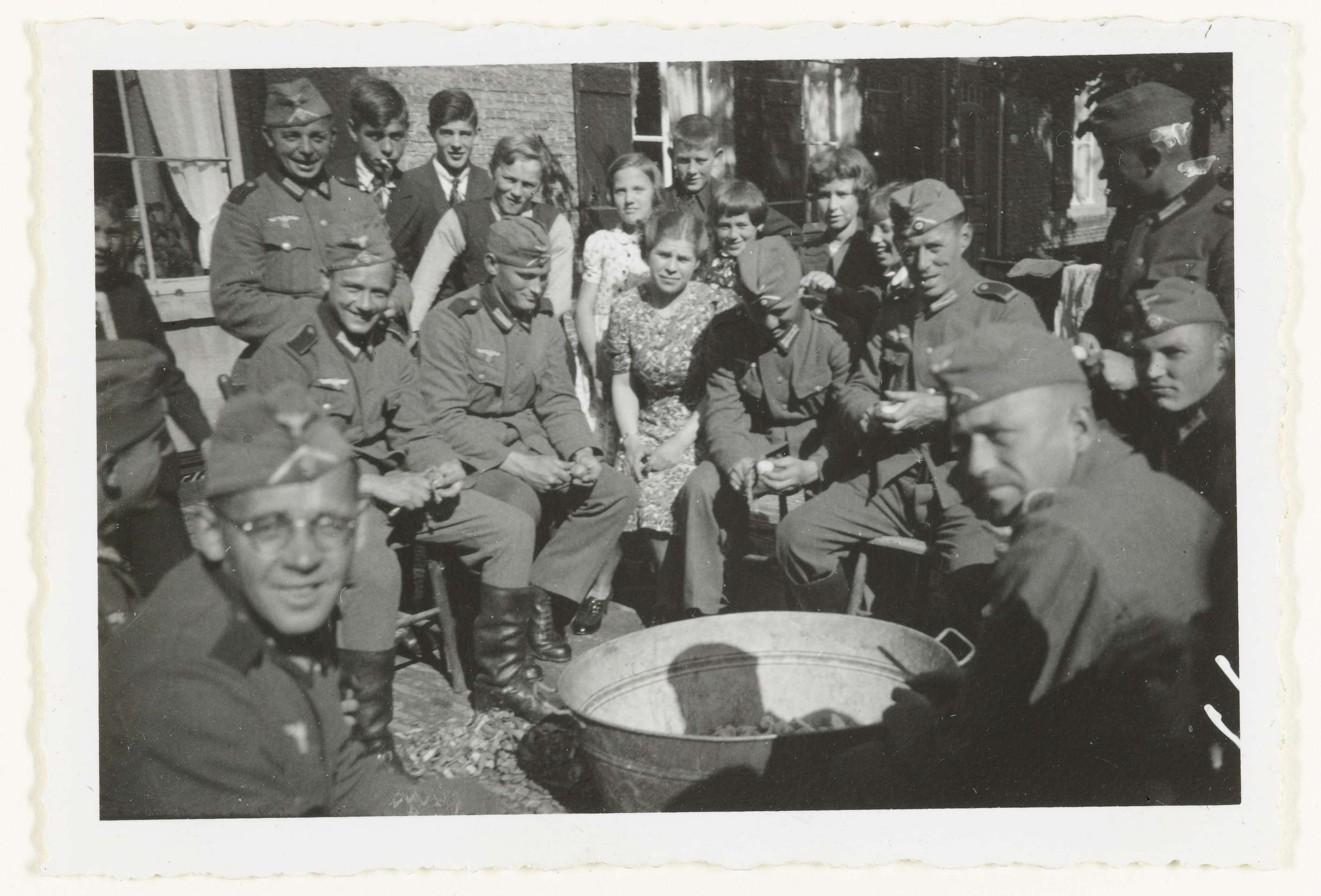 Tien Duitse soldaten helpen met aardappelen schillen. De aardappelen gaan in een grote teil. Om hen heen staan tien Nederlandse kinderen. Het is mooi weer en het gaat er gemoedelijk aan toe. Op de achterzijde staat: Holland Sept. 1940. Adriane zwischen den II Zug.