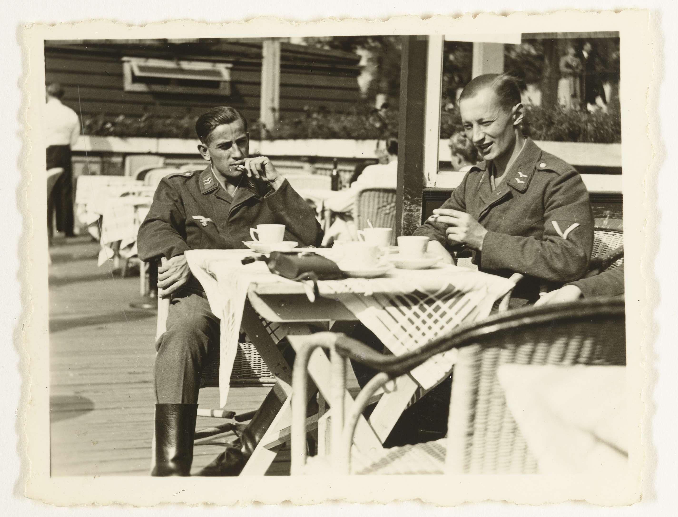 Drie Luftwaffe soldaten zitten op een terras. Op tafel staan kopjes en ligt wat lijkt op een tas voor een camera. Van de derde soldaat is alleen de arm te zien. Beide anderen zijn blootshoofd en roken een sigaret. Links achter is nog de ober te zien.