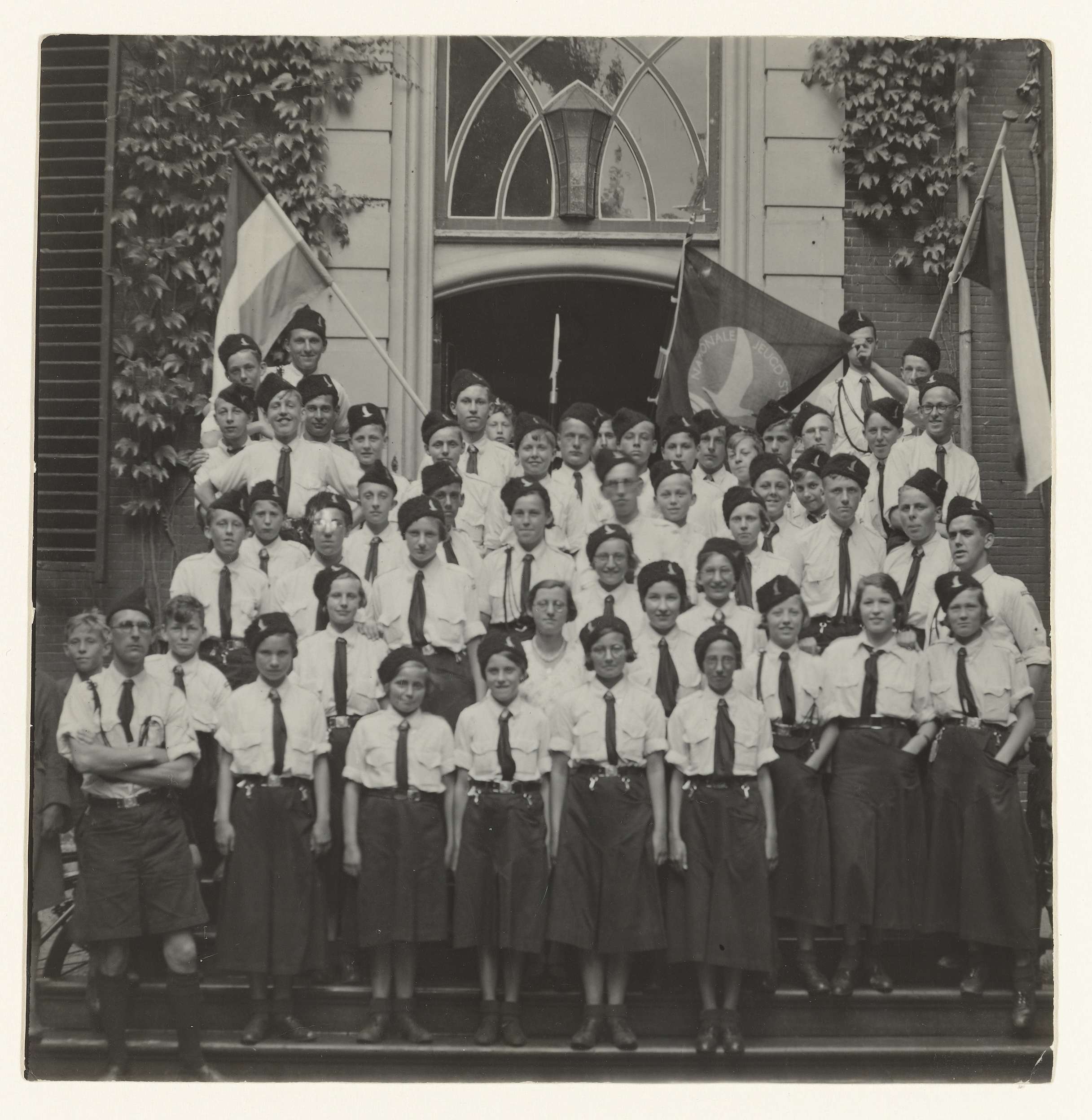 Een groep jongens en meisjes, met volwassen begeleiders, in het uniform van de (Nationale) Jeugdstorm op het bordes van een voormalig kasteel, landgoed Rhijnauwen, sinds 1933 een jeugdherberg. Op de achtergrond de Nederlandse vlag en de vlag van de Jeugdstorm: een vliegende meeuw met daarom heen de tekst "Nationale Jeugdstorm".