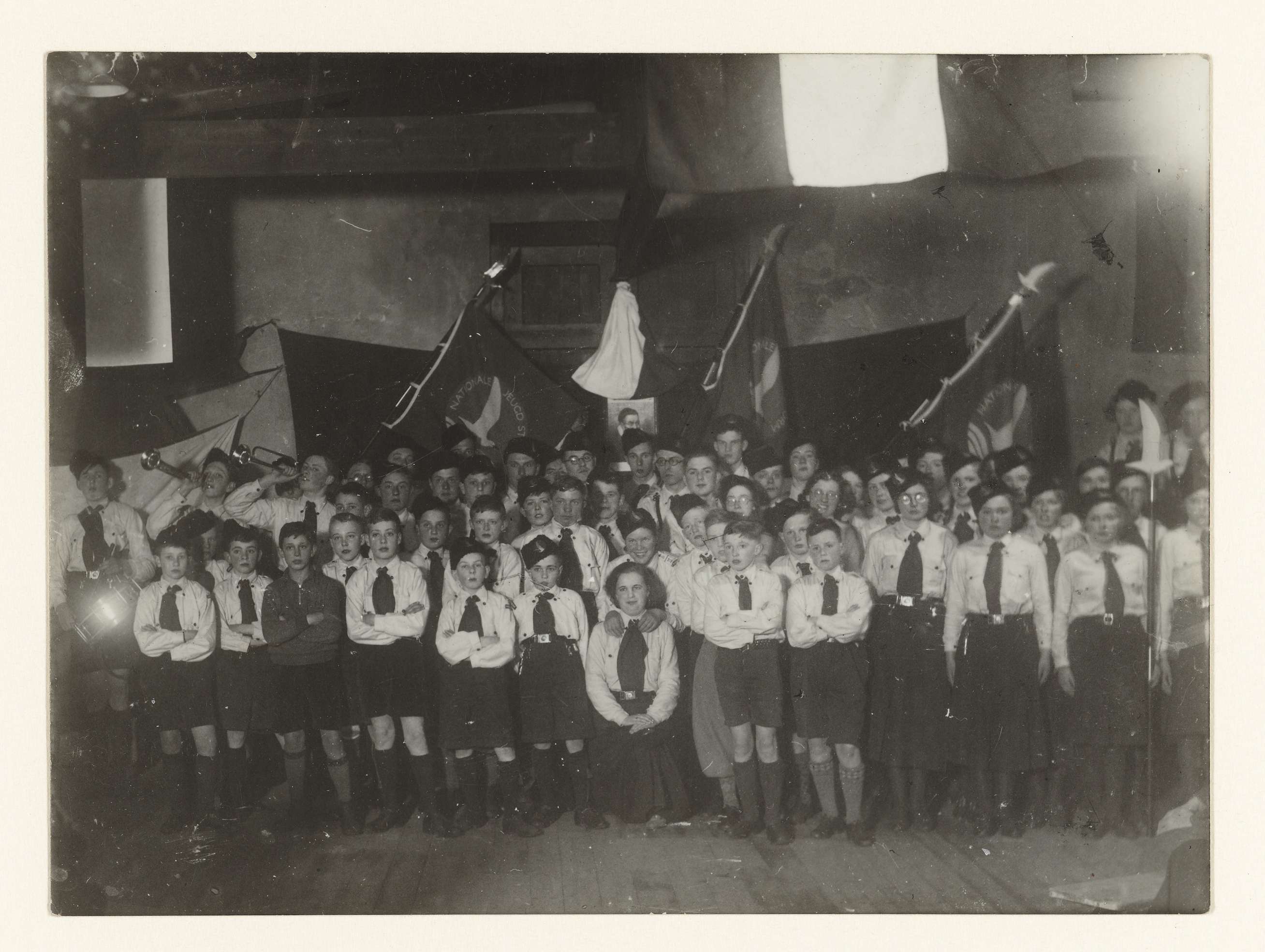 Een groep jongens en meisjes, met volwassen begeleiders, in het uniform van de (Nationale) Jeugdstorm op een podium. Links kinderen met trompetten en een trommel. Op de achtergrond drie vlaggen van de Jeugdstorm en het portret van Willem van Oranje. Rechts staat een kind met een stok, versierd met een vliegende meeuw, symbool van de jeugdstorm.