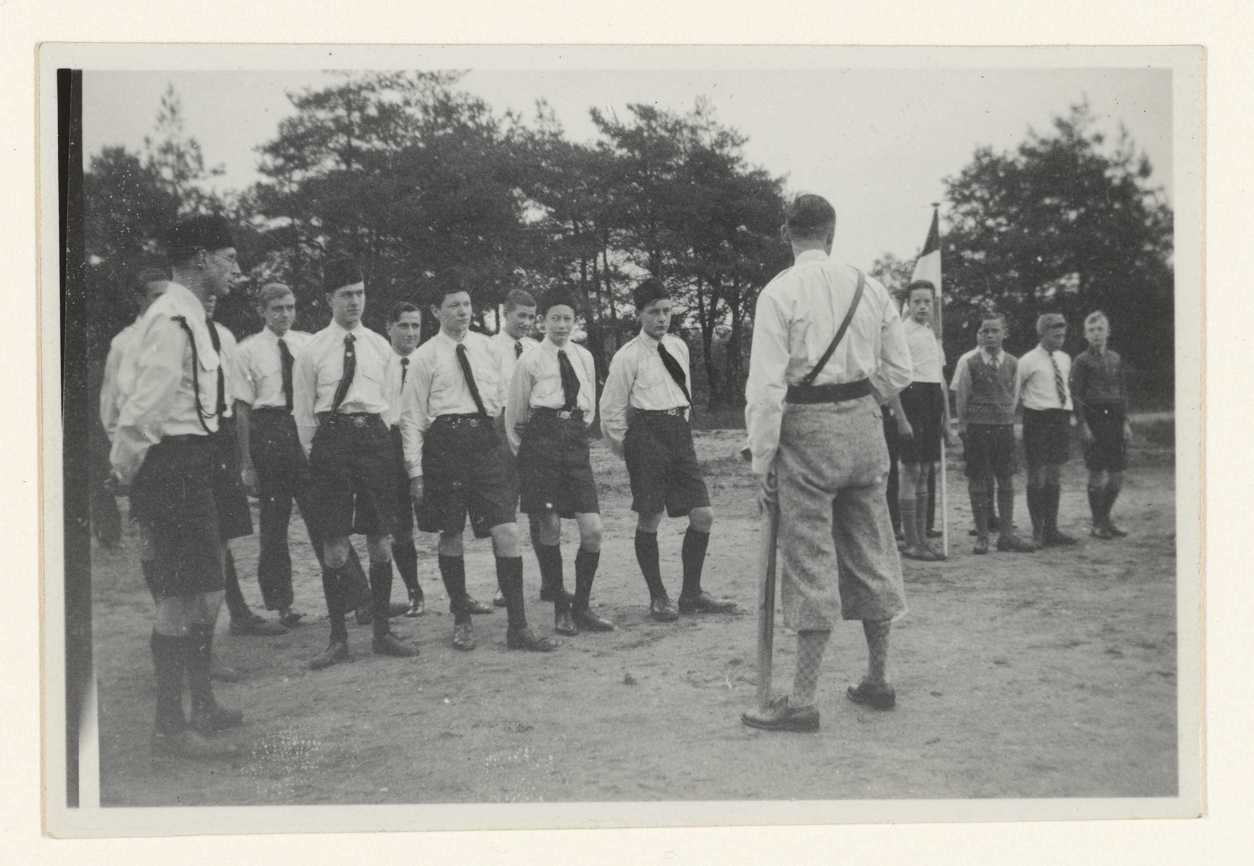 Jongens van de Jeugdstorm luisteren naar Van Geelkerken, (in plusfour) leider van de Jeugdstorm, op een jeugdkamp. Van Geelkerken droeg de titel: Hoofdstormer. Op twee na zijn ze allemaal in uniform. Rechts houdt een van hen de Nederlandse vlag vast.