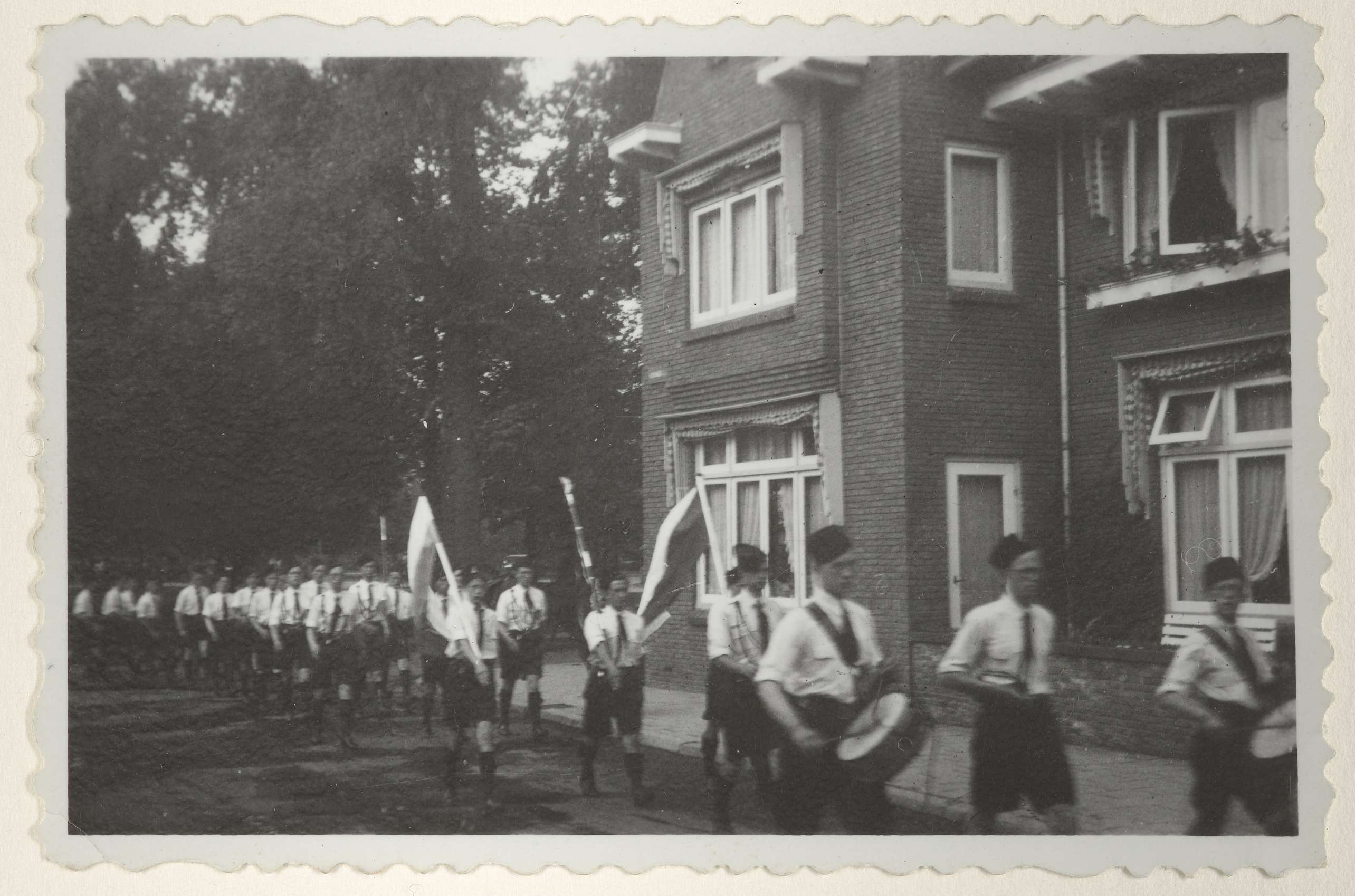 Een optocht van de Jeugdstorm. Voorop twee mannen met trommels, verderop in de stoet de Nederlandse vlag, Jeugdstorm vlag en een derde vlag. De stoet loopt het Wilhelminapark? uit. De stoet is iets verder en loopt langs huizen. Allen zijn in uniform.