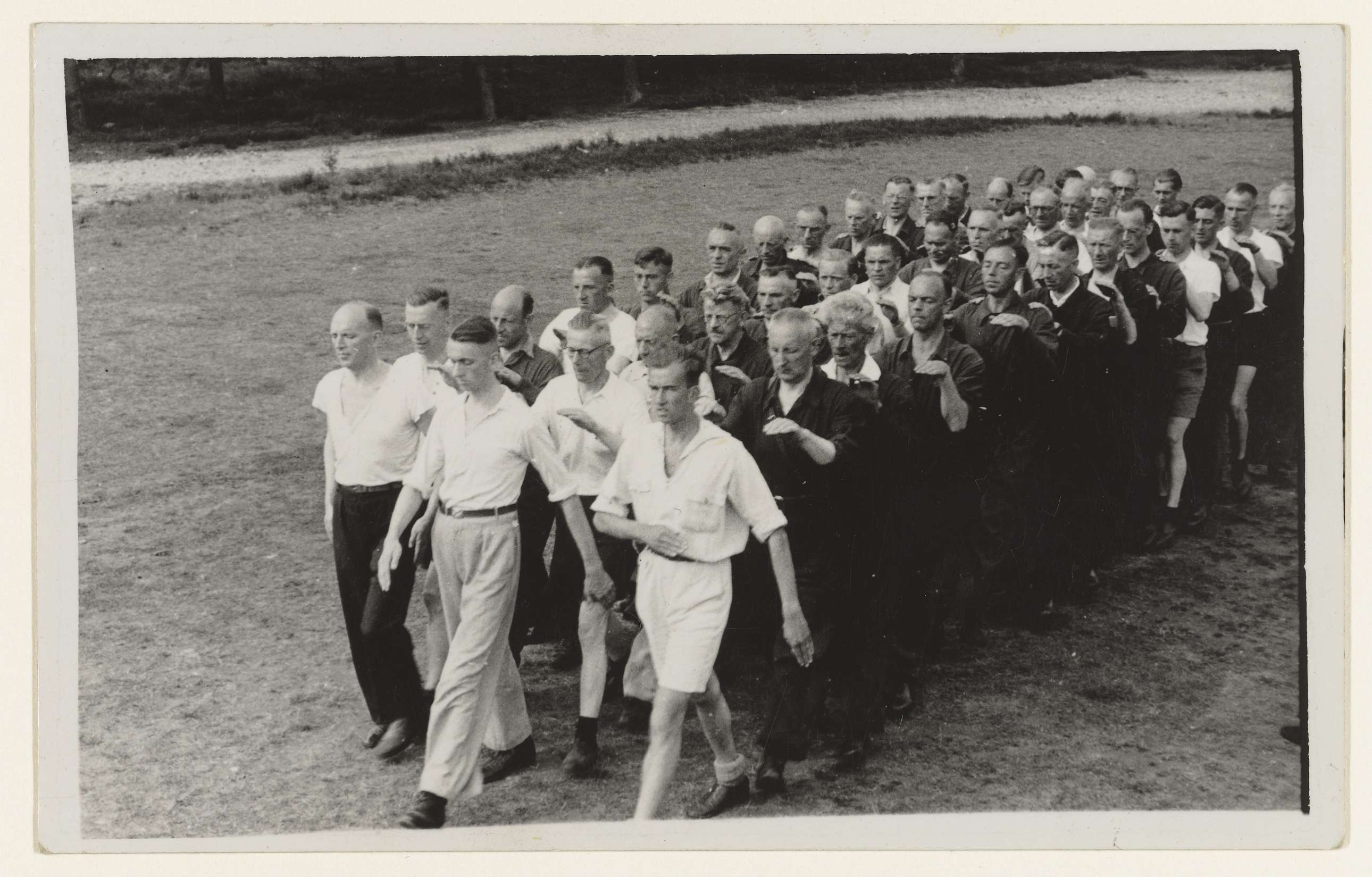 Drie rijen mannen lopen over een grasveld. Handen op de schouders van de man voor hem. Rechts mannen in overalls, sommige anderen in korte broek of lange broek. De mannen worden opgeleid op de Scheleberg in Lunteren voor de Landwacht. Opgericht in november 1943 als beschermingsorganisatie voor de NSB na een aantal aanslagen op vooraanstaande NSBers. Al snel kwam de Landwacht onder controle van de Duitsers en werd ook als hulppolitie ingezet. De Scheleberg werd gebouwd als vakantieoord voor de leden van de Algemeene bond voor handels- en kantoorbedienden.
