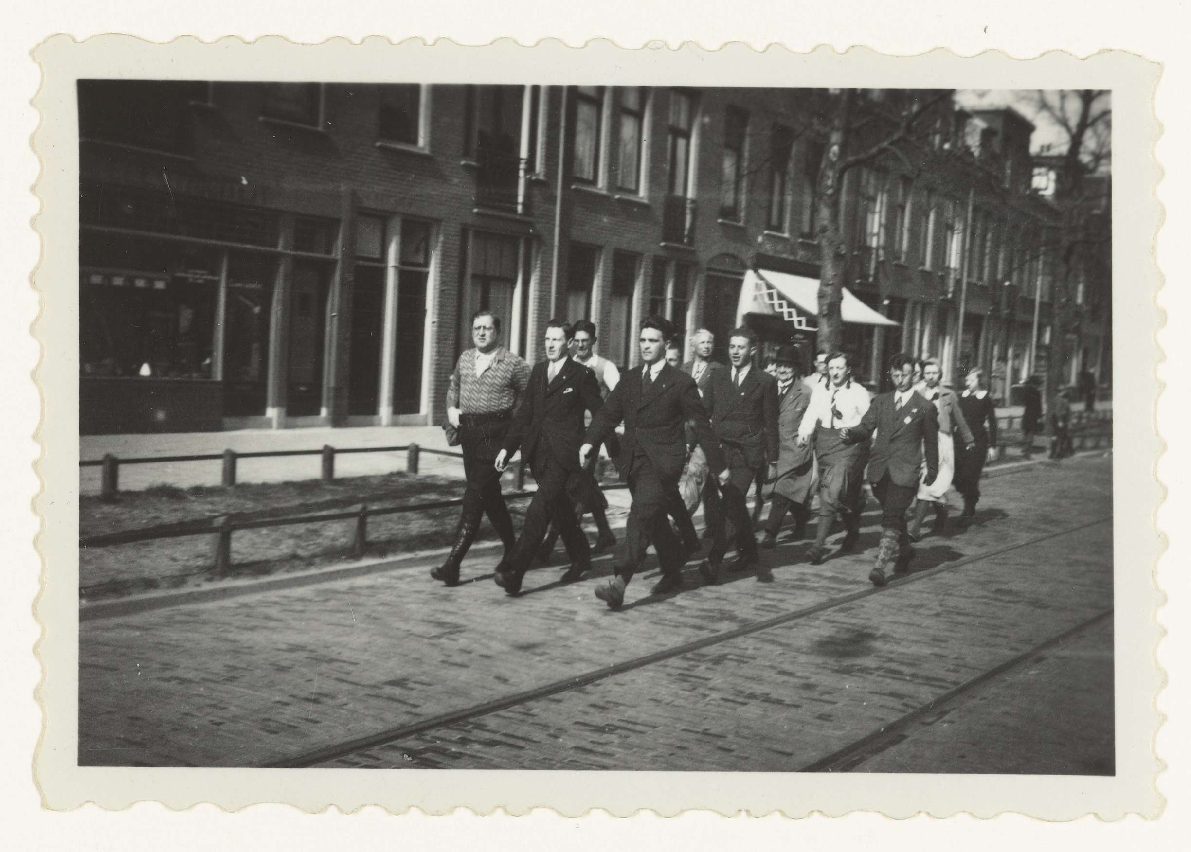 Optocht van de NSB. Voorop drie mannen waaronder de man in de geruite pullover. Niemand is in uniform, wel hebben sommigen hoge laarzen aan. Links een rij huizen. Vanaf 1936 gold voor de NSB en aan hen verwante organisaties een verbod om in uniform op straat te verschijnen.