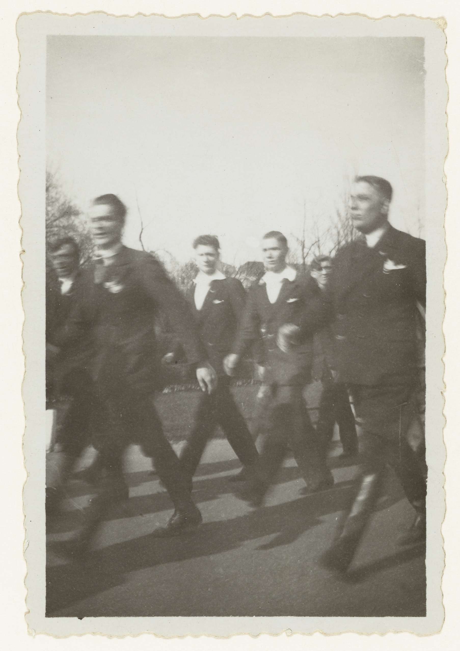 Optocht van de NSB. Voorop twee mannen in hoge zwarte laarzen. Niemand is in uniform. Vanaf 1936 gold voor de NSB en aan hen verwante organisaties een verbod om in uniform op straat te verschijnen.
