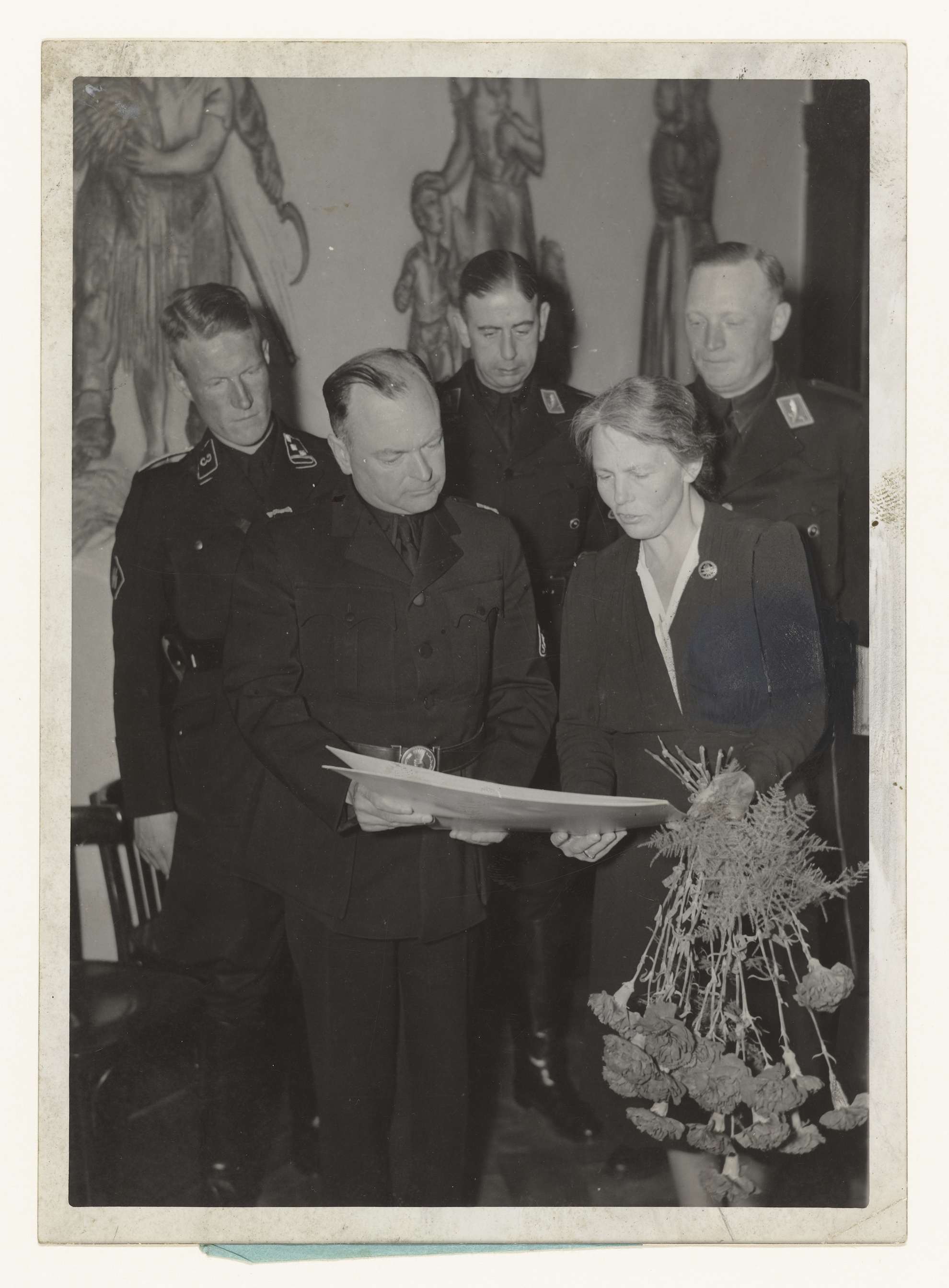 Mussert ontvangt een ets, die hem wordt aangeboden door mevrouw de Ruiter-van Lankeren Mathes tijdens zijn bezoek aan de provincie Noord-Holland. Mevrouw de Ruiter is de leidster van de NSVO, Nationaal Socialistische Vrouwen Organisatie. Mussert krijgt dit cadeau in het NSVO huis in Amsterdam. Achter Mussert drie NSBers, links Wim Heubel, Nederlandse SSer en broer van de Zwarte Weduwe Rost van Tonningen. Op de muur een versiering met vrouwen.