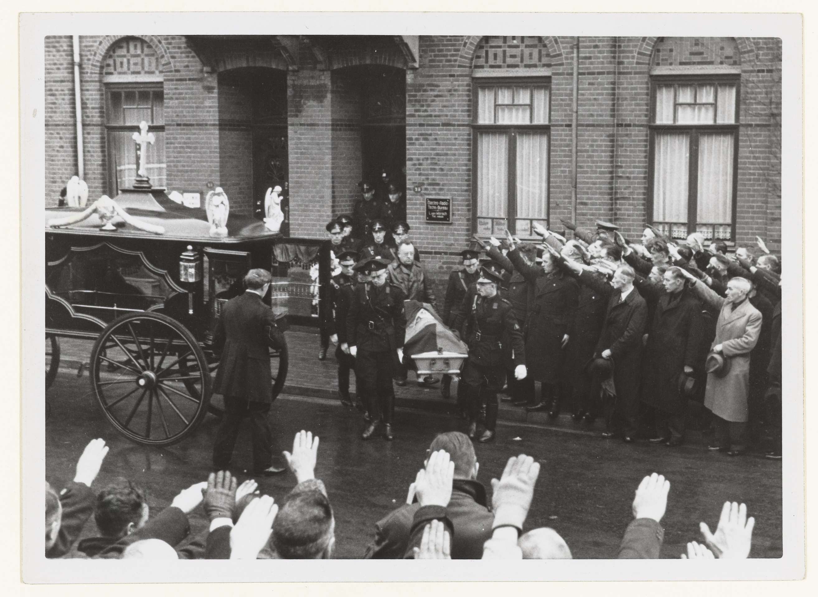 De begrafenis van Hans Pelzer, lid van de WA in Limburg. Hij kwam om het leven bij een gevecht tussen WAers en de Marechaussee op 22 maart 1941. De kist wordt naar buiten gedragen, een koets staat klaar. Een groep mensen in burger brengt de NSB groet.