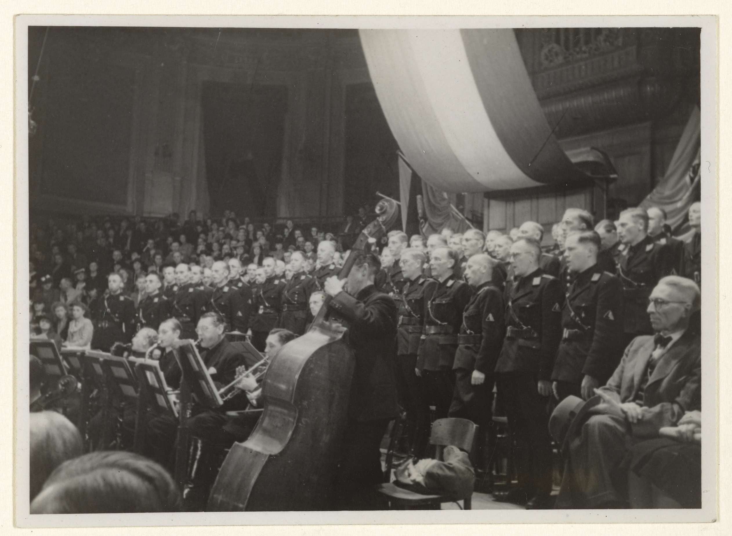 Een groep leden van de WA, Weerafdeling van de NSB, houdt een zanguitvoering. Vooraan het orkest, erachter het mannenkoor, allen in uniform. Boven hun hoofd de Nederlandse vlag (waarschijnlijk de Prinsenvlag). Het betreft een Oostfront-middag in het Concertgebouw in Amsterdam, de opbrengst was bestemd voor Frontzorg.