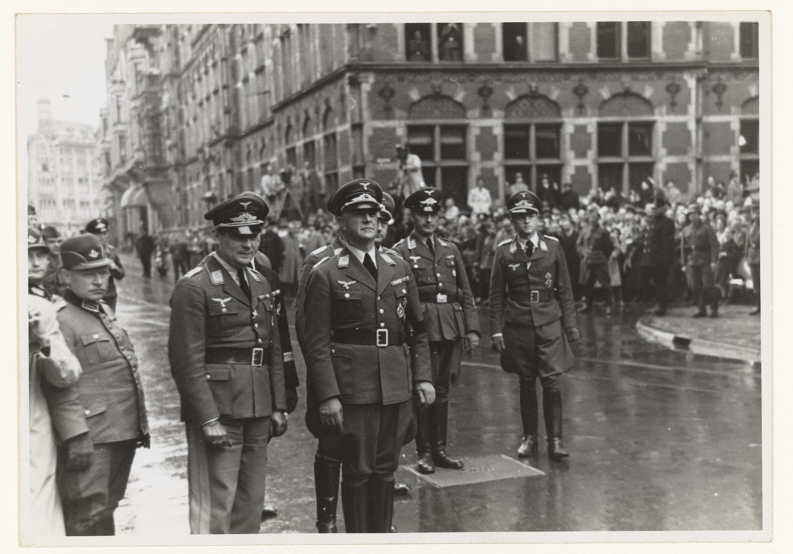 General der Flieger en Oberbefehlshaber der Wehrmacht Friedrich Christiansen (derde van links) arriveert in Den Haag op de Lange Poten in gezelschap van een aantal hoge Duitse officieren. Op de achtergrond toeschouwers en fotografen. Hij bleef gedurende de oorlog de bevelhebber van de Wehrmacht in Nederland. Hij was ook degene die in 1944 opdracht gaf tot de razzia in Putten.