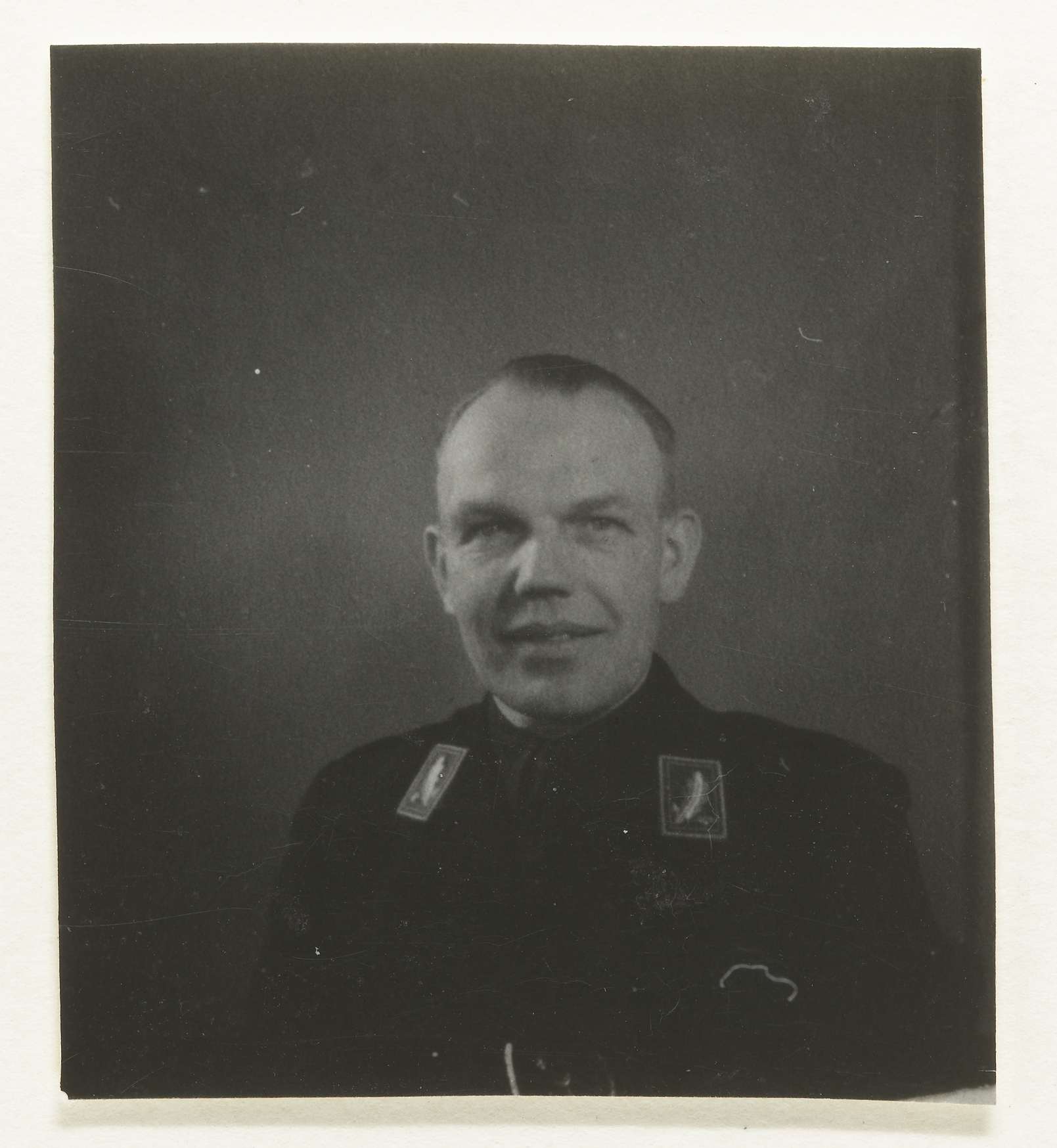 Portret van een lid van de NSB, Wouter Roelof Jager, burgemeester van Enschede (op achterkant foto). Op zijn kraag een distinctief met een blad met nerven. Dit betekend een functie bij het hoofdwartier van de NSB, in dit geval Hoofd van Afdeeling. Man glimlacht, kijkt recht in de camera en is blootshoofd.