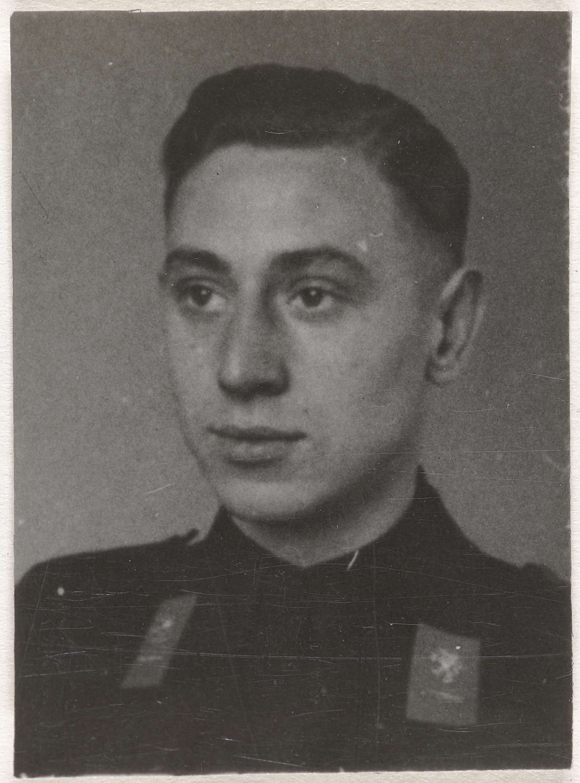 Portret van een lid van de NSB. Op zijn kraag een distinctief met de Nederlandsche leeuw en een streep: Administratief personeel/ Helper. Blootshoofd.