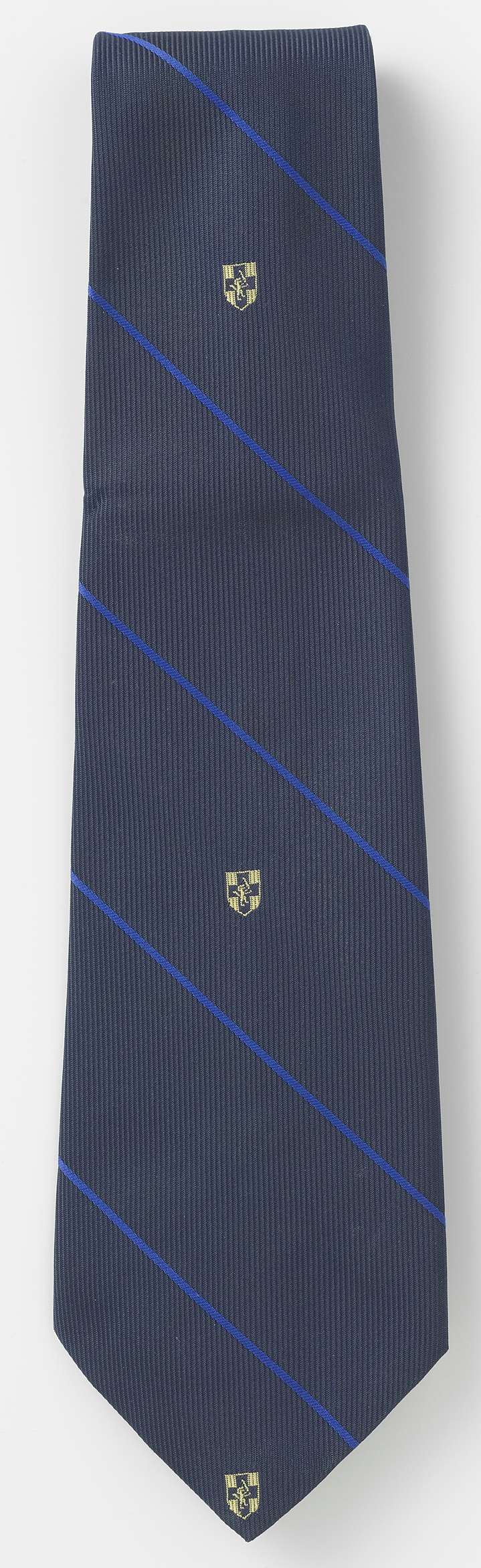 Donkerblauwe das met lichtblauwe schuine strepen en gouden emblemen met de Hollandse Leeuw.