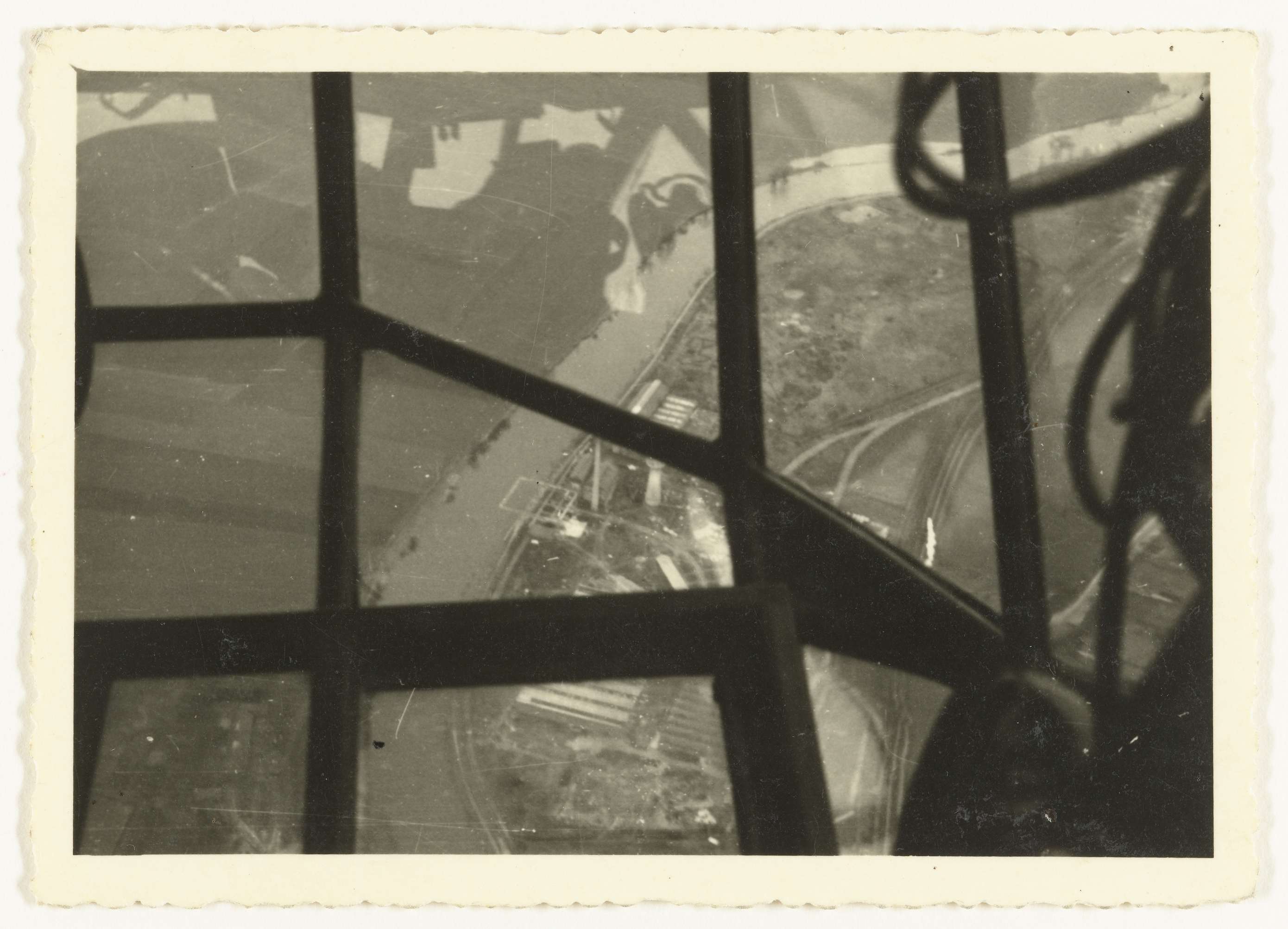 Een deel van Nederland gezien door de ramen van de cockpit van een Duits gevechtsvliegtuig, een Junkers 88, vermoedelijk genomen tijdens de inval in Nederland op of direct na 10 mei 1940. Beneden is een rivier te zien en iets wat lijkt op een treinstation.