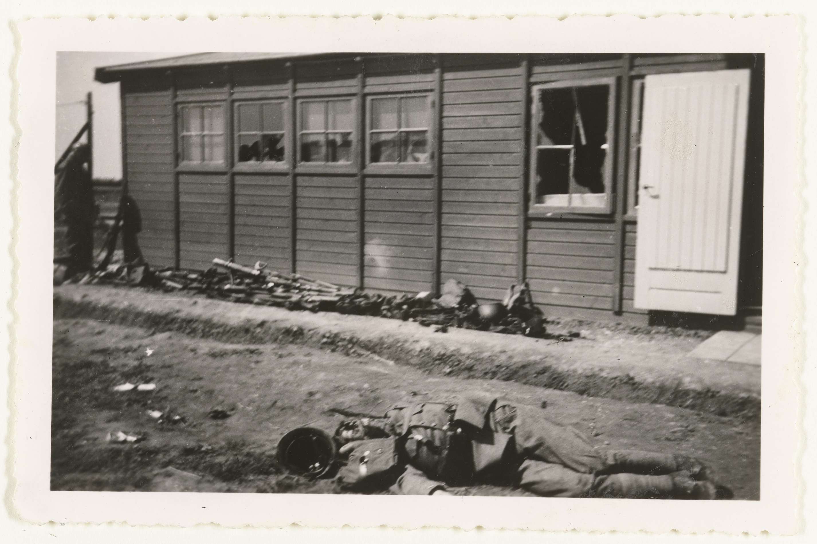 Dode Nederlandse soldaat voor een barak
