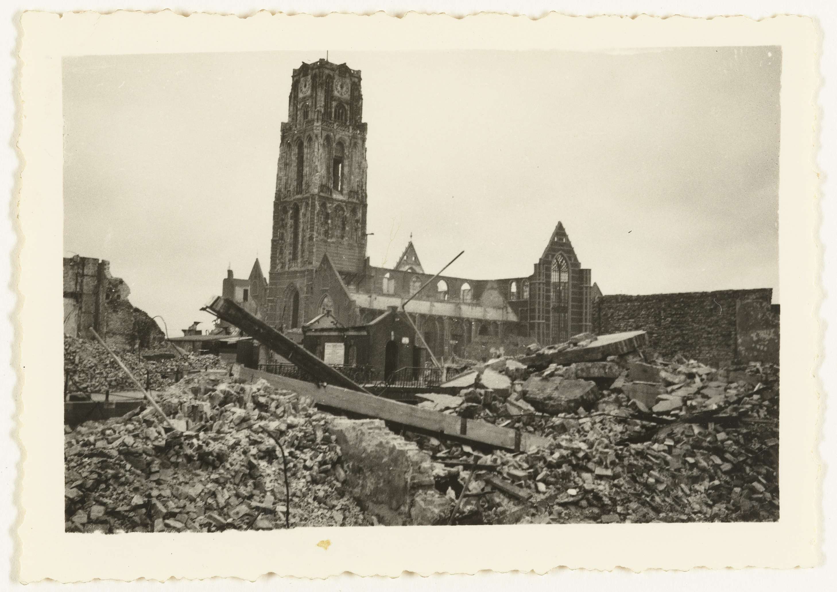 Ruïnes van gebouwen in Rotterdam. Nog deels overeind de Laurenskerk