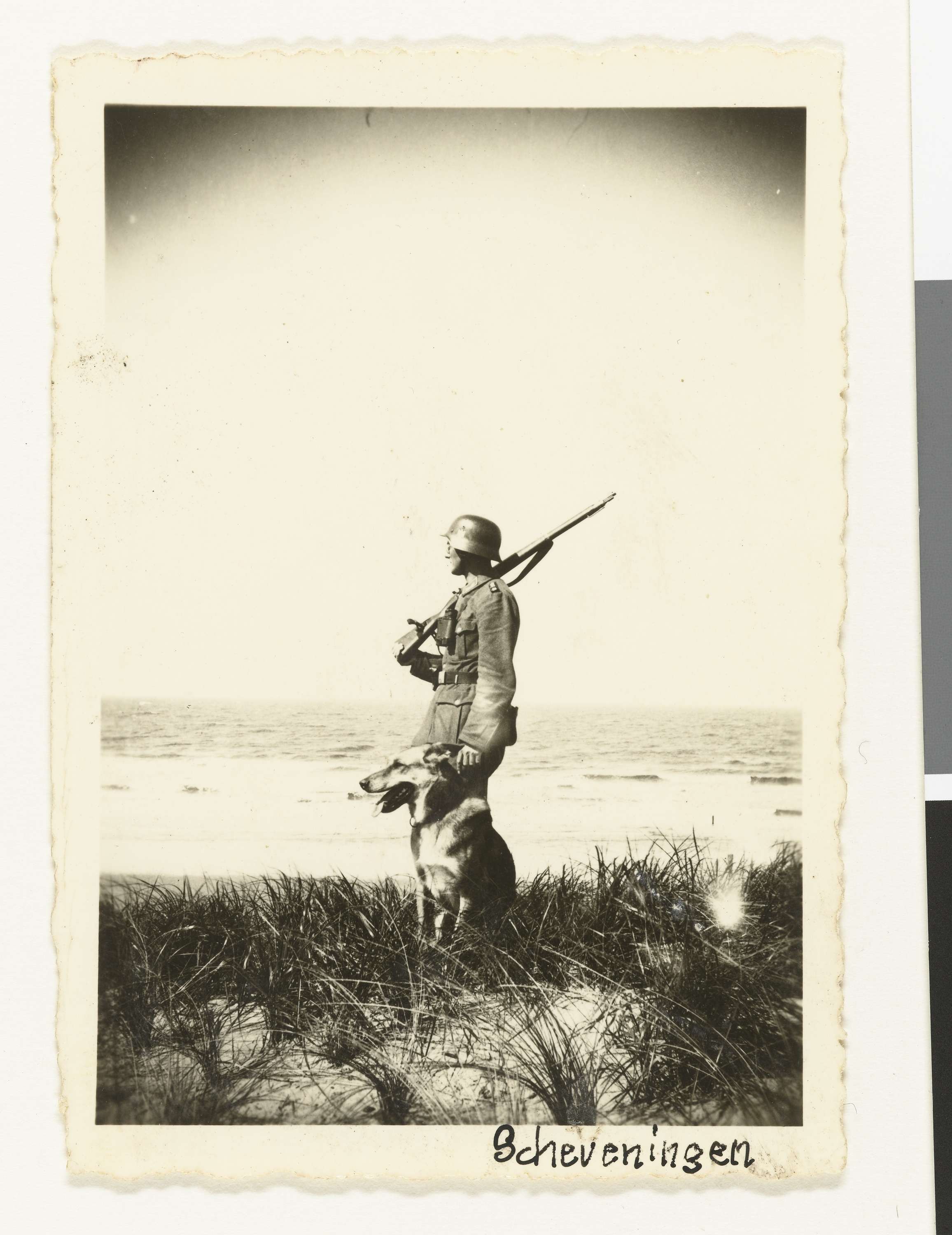 Een Wehrmacht soldaat heeft zich laten fotograferen op een duin bij de zee bij Scheveningen met een herdershond. (Zelfde soldaat als op NG-2007-5-35). De soldaat heeft een helm op, draagt een bril? en een geweer.