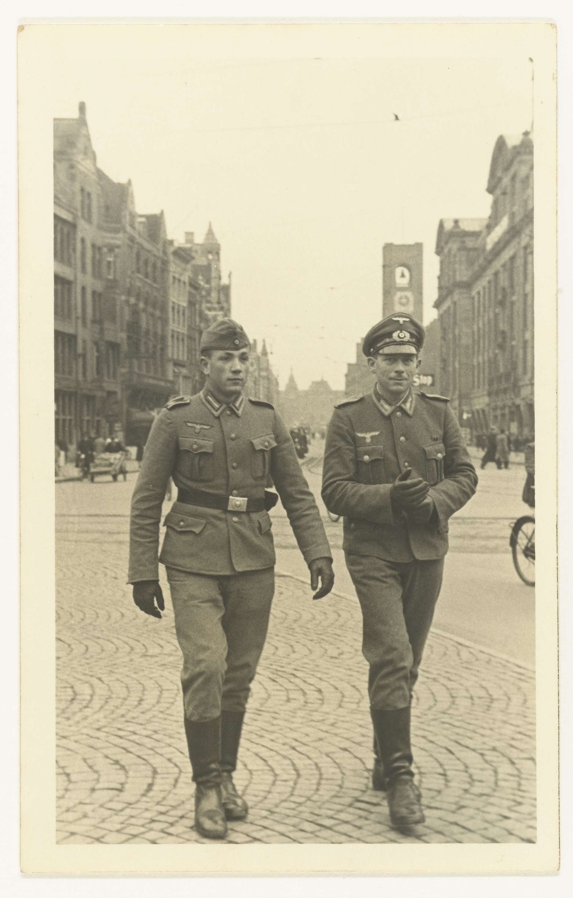 Twee Wehrmachtsoldaten, een van de Luftwaffe, lopen in Amsterdam over de Dam bij de Bijenkorf. Zelfde twee soldaten als op nr. NG-2007-5-46. Het zou gaan om leden van een kustwachtbatterij.