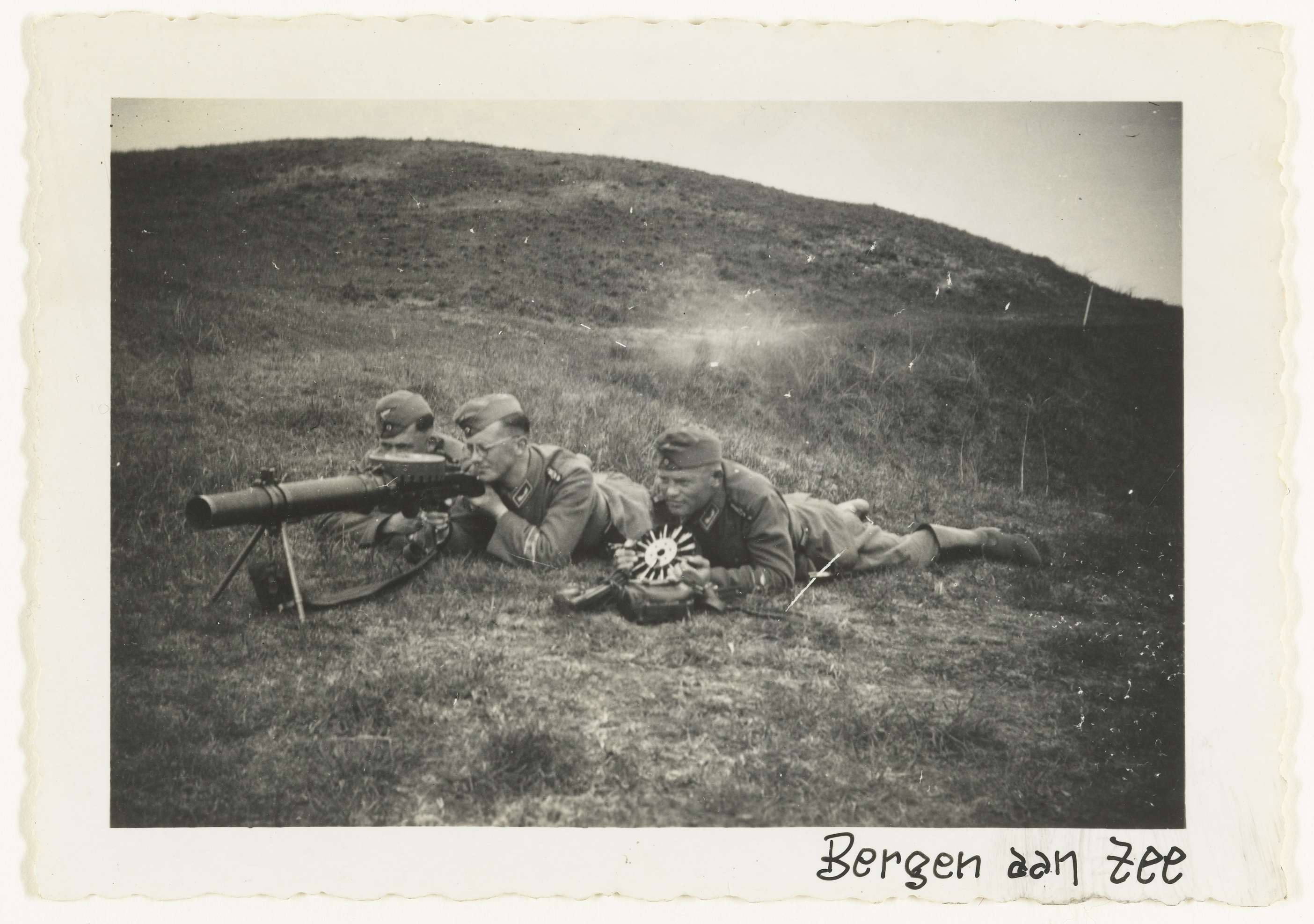 Drie Wehrmachtsoldaten liggen plat op de grond in de duinen bij Bergen aan Zee. Twee bedienen een op de Nederlanders buitgemaakte Lewis mitrailleur, de derde heeft een rond patroonmagazijn in handen, dat op de mitrailleur geplaatst kan worden. Mogelijk grenswachttroepen.